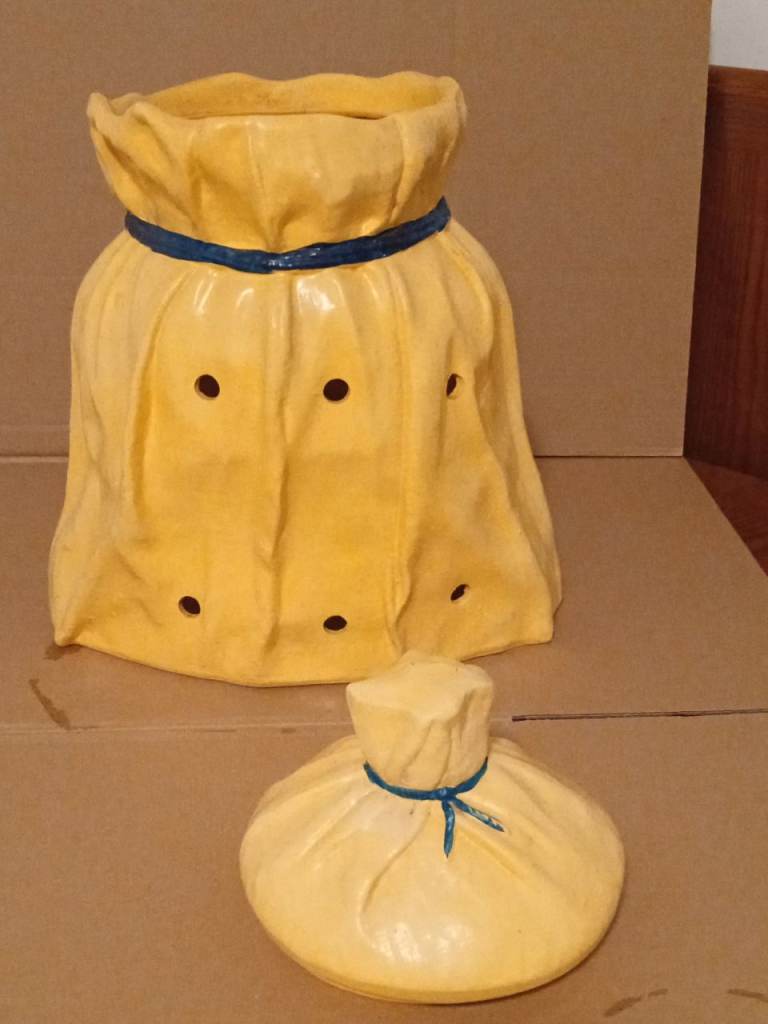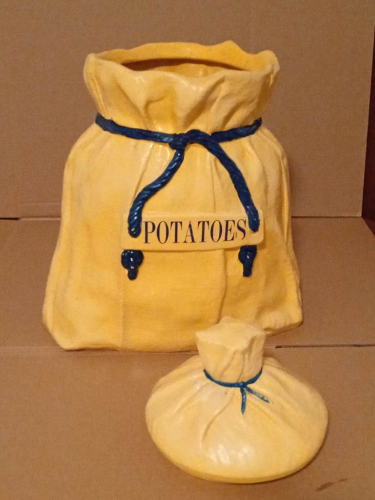 Vintage ceramic potato sack to store potatoes in a ventilated ceramic container it stands 14 inches tall and 14 inches wide so there is plenty of room to store a bag of potatoes in and keep them out of sight but close at hand keeps them out the way and fresh I can deliver to Glasgow and the surrounding areas free of charge