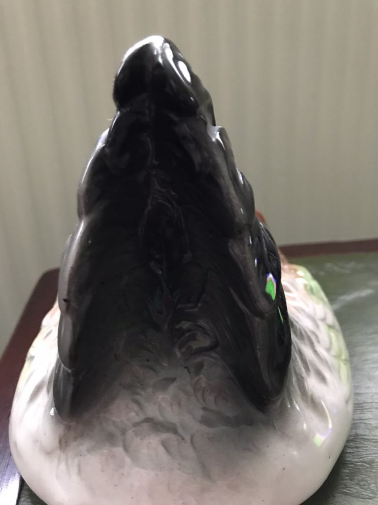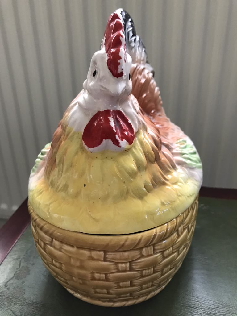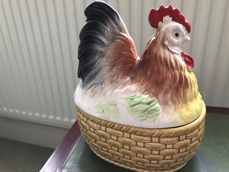 Colourful Vintage Ceramic Hen/Rooster Egg Storer/Holder/Basket. Made in Japan. Holds 8 medium sized eggs. Some red paint has flaked away which I’m sure could be touched up with the appropriate paint and there is a very small chip at the top of the basket which is hardly noticeable and not visible at all when the hen is sitting on top (see photos). Overall, in very good condition for its age.