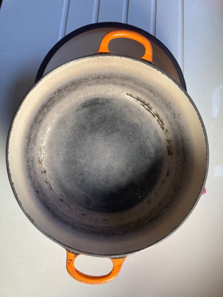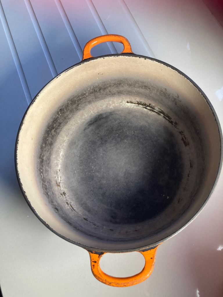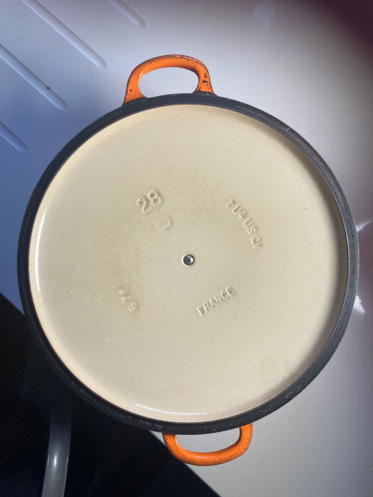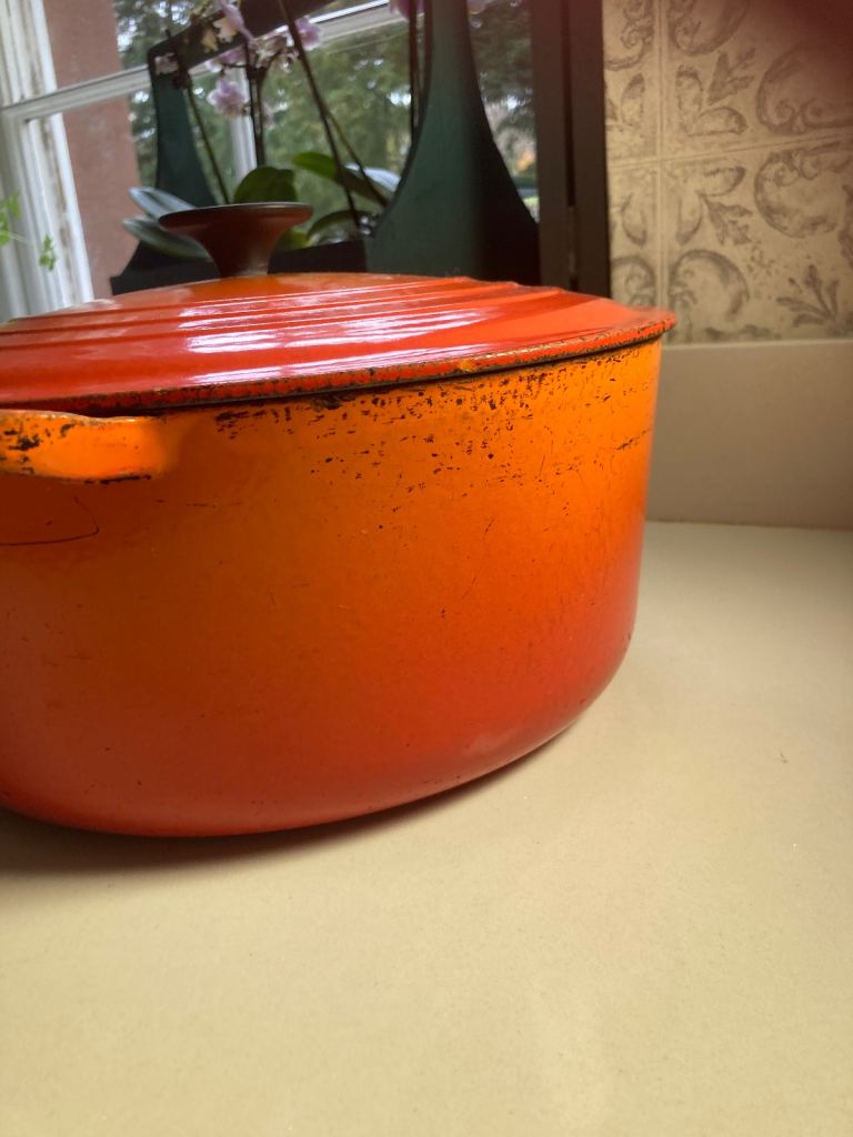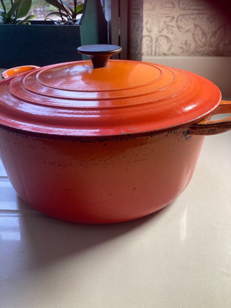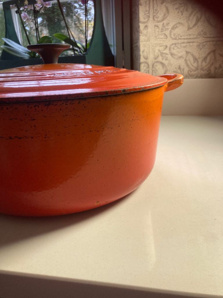 Very Large Vintage Le Creuset Dutch Oven Orange Flame, 86cm. Very heavy and can be used on gas and electric.
