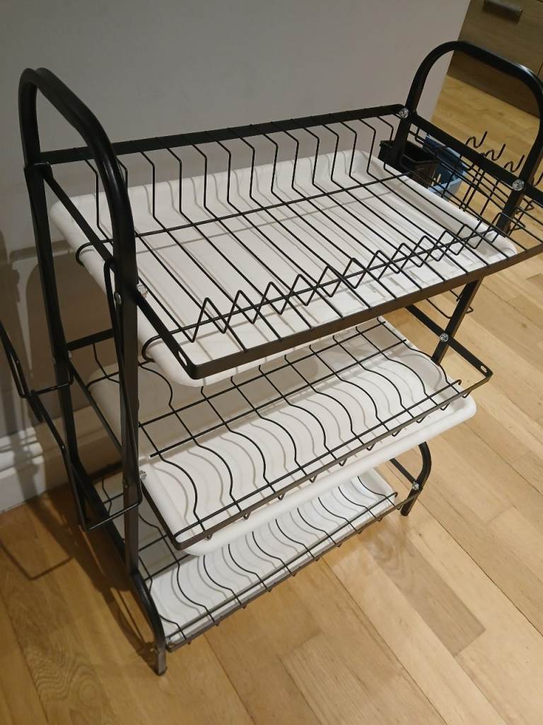 Cuttlery drainer. Brand new, never used. No box. Has been put together already. No issues, I just can't use it because I have low cupboards over my draining board so unable to use it.