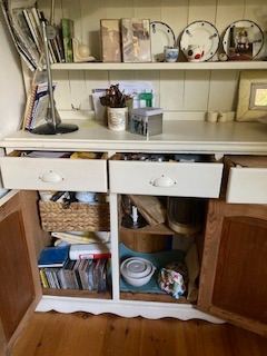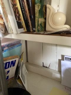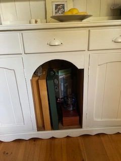 Some small damage to back panels; the final one doesn't quite fit into the corner but this is covered by books (or anything). 2 shelves in each cupboard; a bit of wood is missing from the central lower store area;