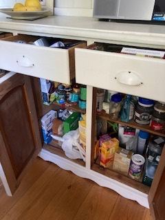 3 shelves + top; 5 drawers and 5 lower storage cupboards;
