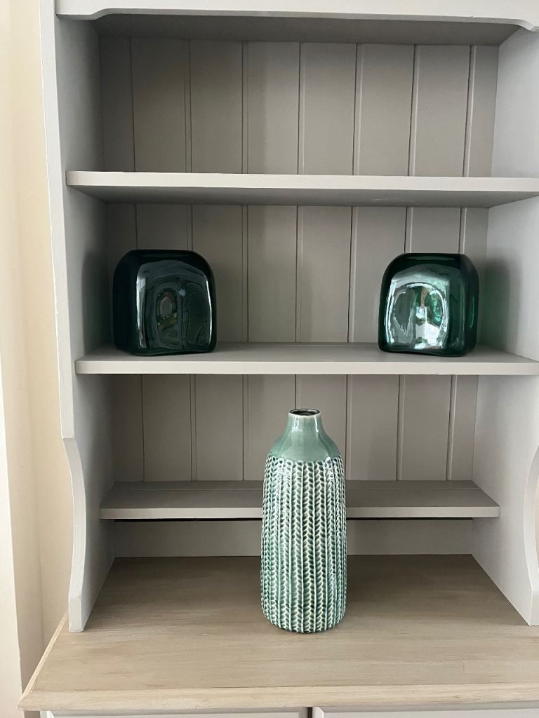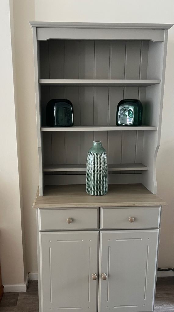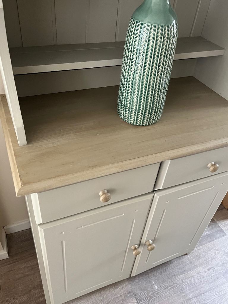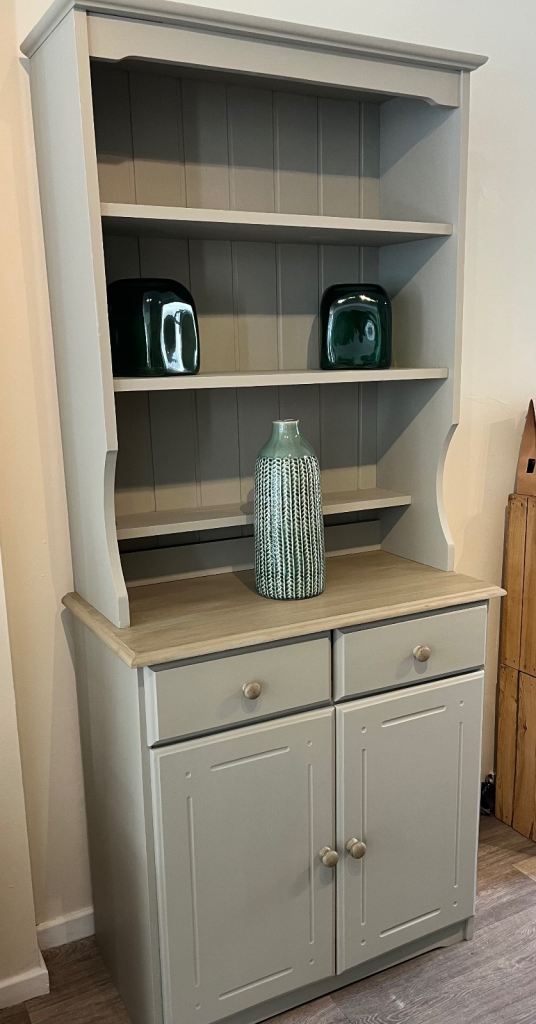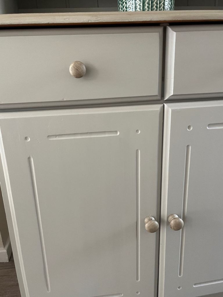 Pine dresser painted in Frenchic Salt of the Earth and the top painted and waxed to give a wood affect
