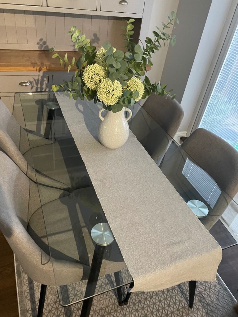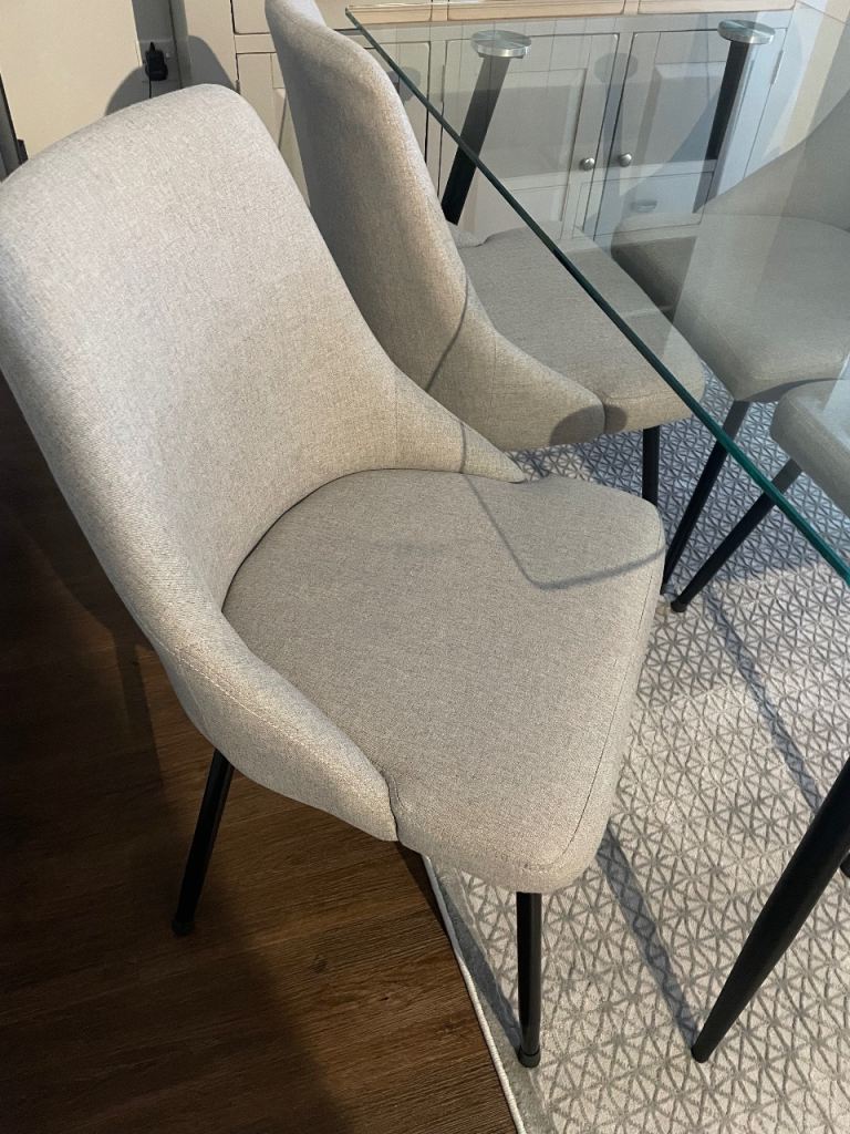 Glass dining table and 4 grey chairs in very good condition. L14xH75xD80cms. Collection only.