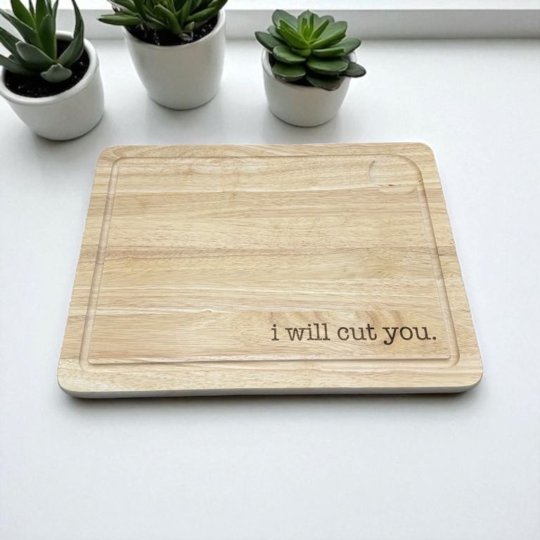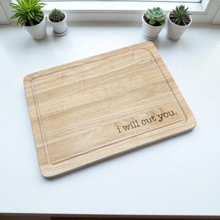 Add a cheeky twist to your kitchen with our “I Will Cut You” chopping board—where culinary prep meets dark humour. Whether you're dicing onions or serving up snacks, this board is guaranteed to raise eyebrows and spark laughter. It’s the perfect gift for foodies who like their kitchenware with a side of sass.