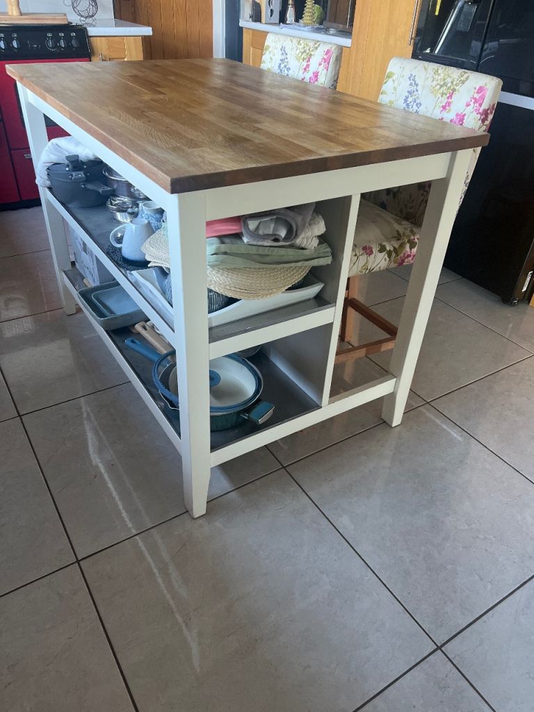 Ikea kitchen island for sale. Cream with wood top. Two metal shelves. Good condition. Collection only please. £100 ono