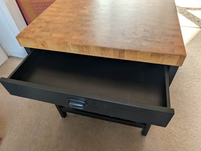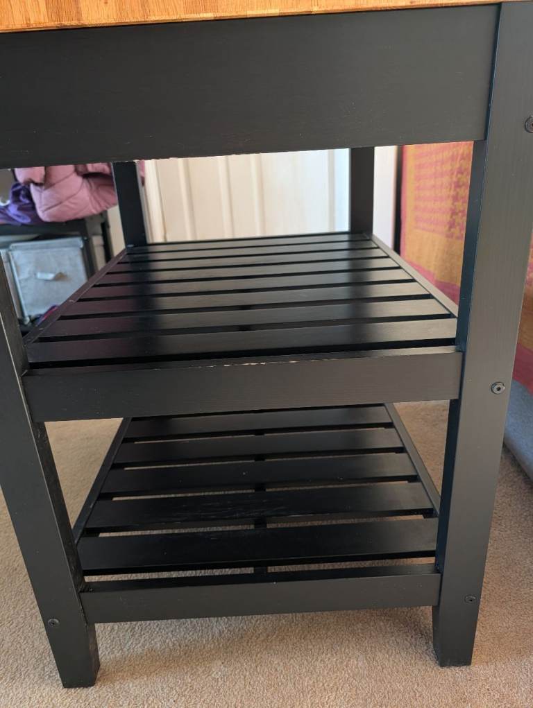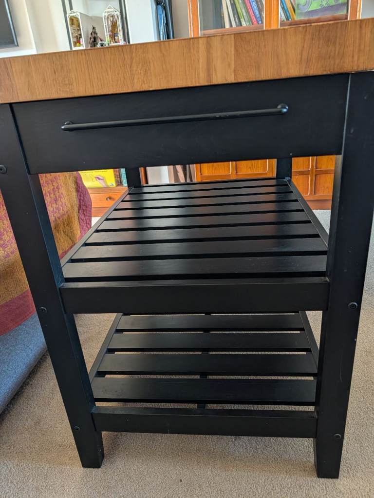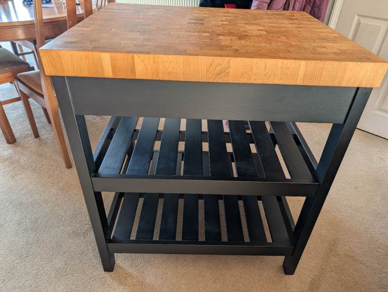 IKEA VADHOLMA kitchen island topped with Butchers block. In generally good condition. Some scuffs around the lower shelving and a littlf damage on the top of the butchers block.