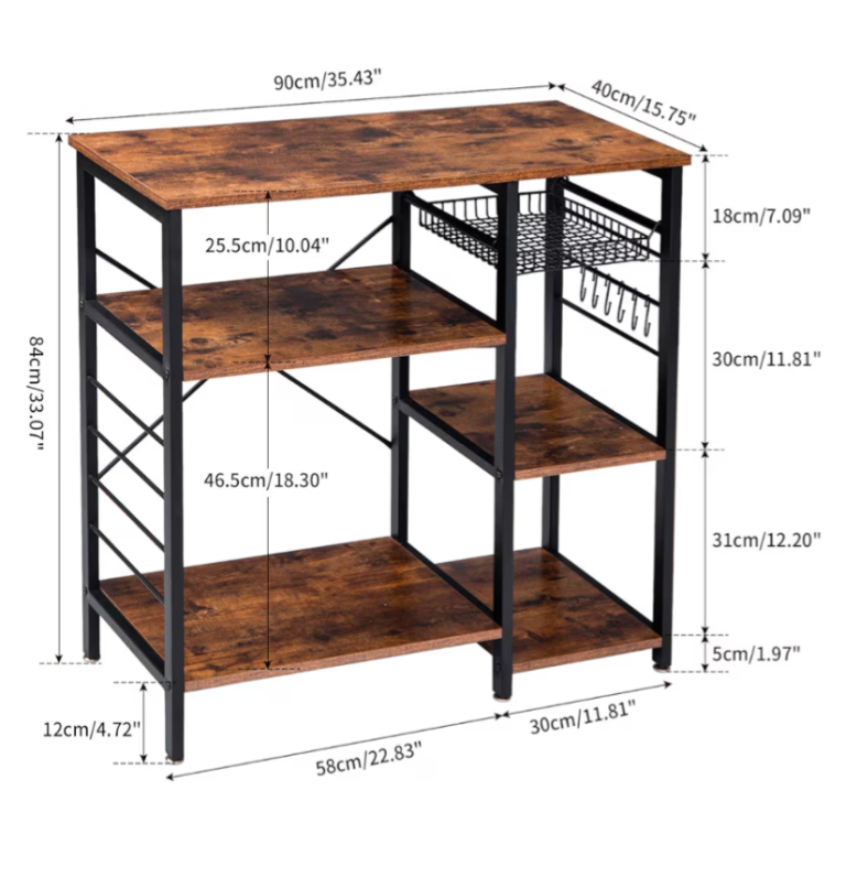 Baker's Rack / Industrial Kitchen Shelf Unit / Microwave Table / Coffee Bar with Metal Mesh Basket and Shelves