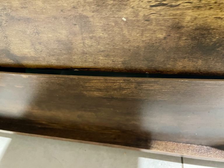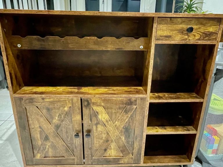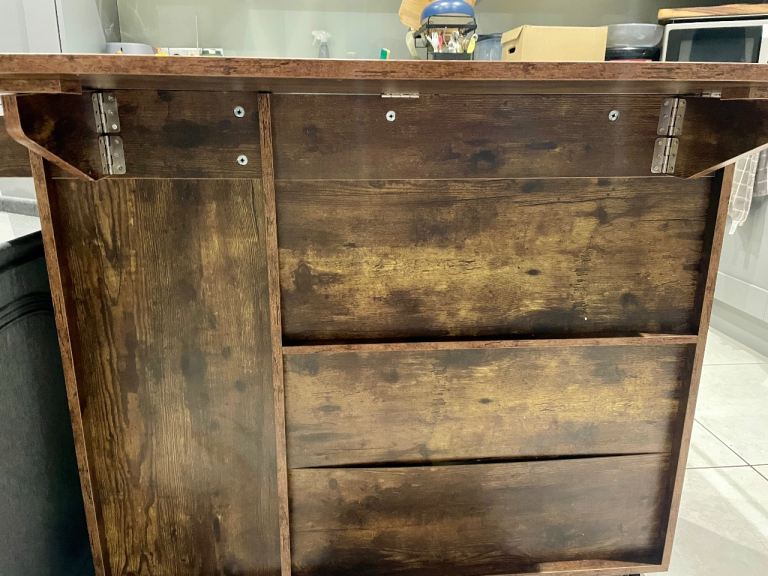 Kitchen island table on wheels, with doors, shelves and a small drawer. Used but in a good condition, the only flaw is the back side is slightly bent as seen in the photo.