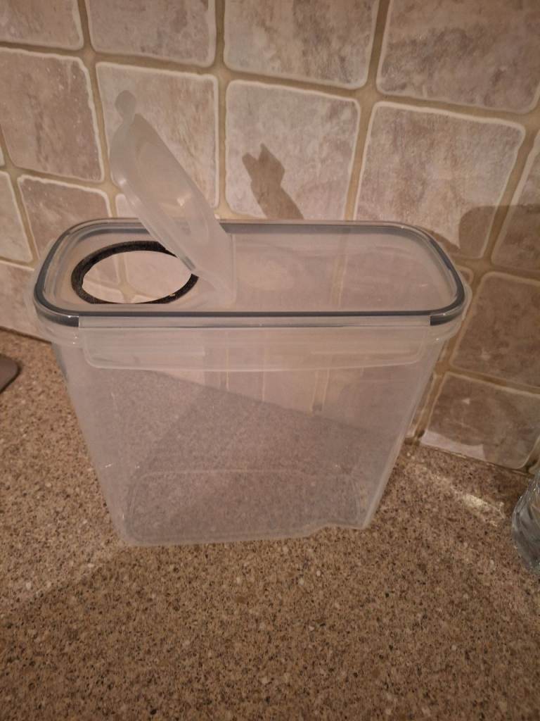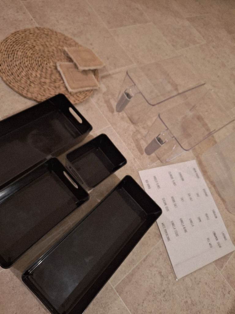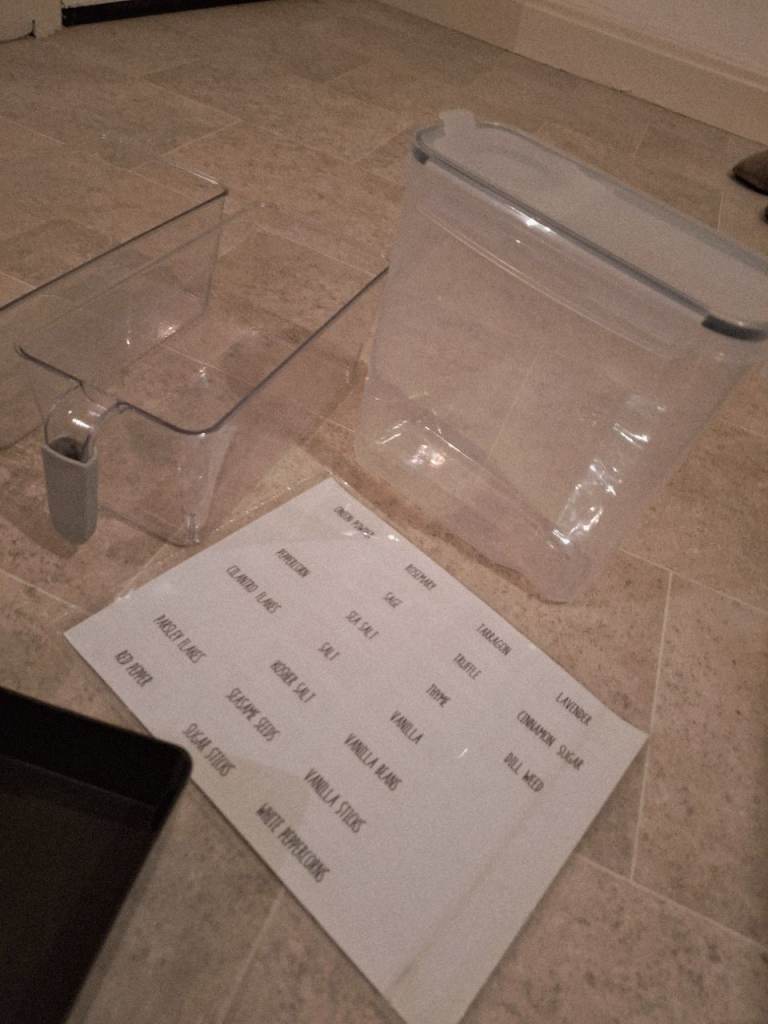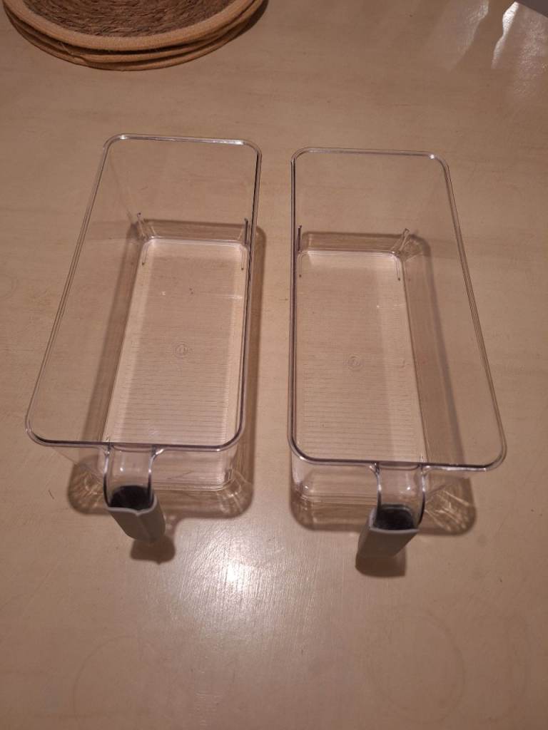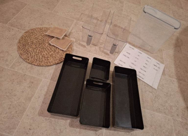 Storage bundle includes, air tight cereal storage container,4 drawer organisers, pantry stickers, wicker placement natural fabric dishwasher pads, pair of fridge organiser drawers with handles.