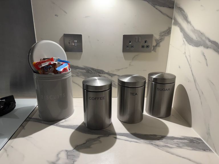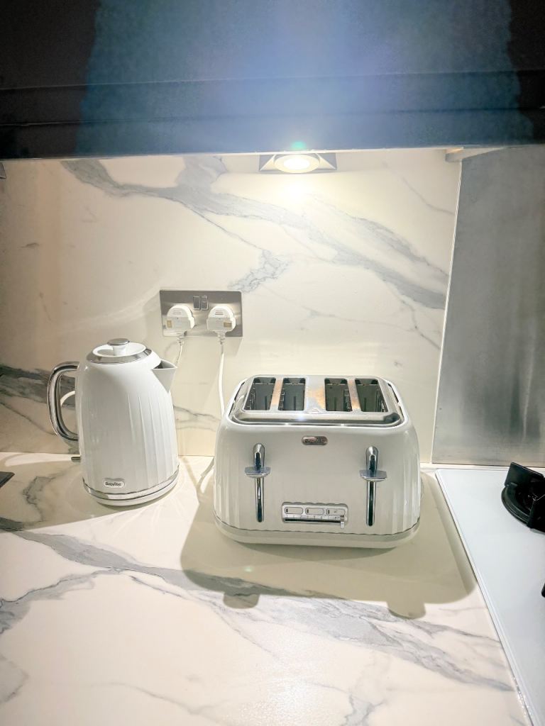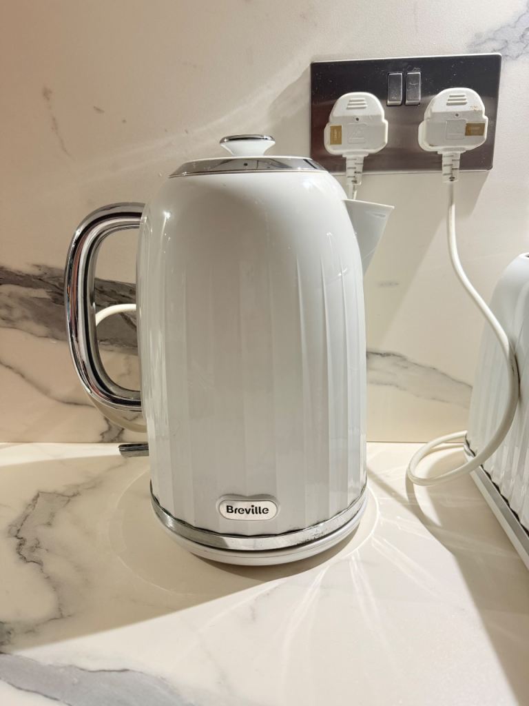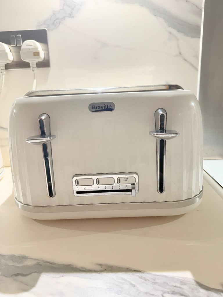 Set of 4 slices Breville white toaster, a Breville white kettle and a set of 4 containers for coffee, sugar, tea and biscuits. Perfect for someone that moved into a new house recently or if looking to change your kitchen utensils.