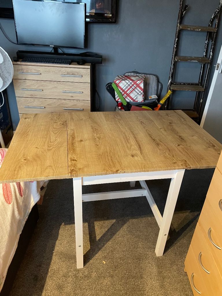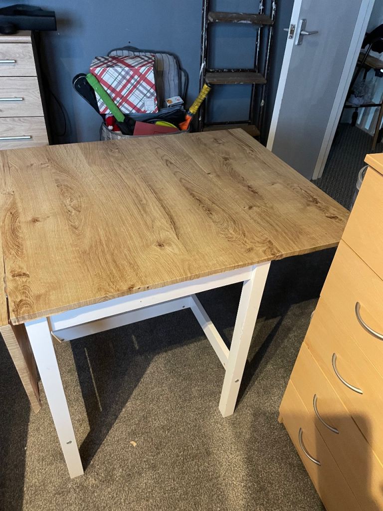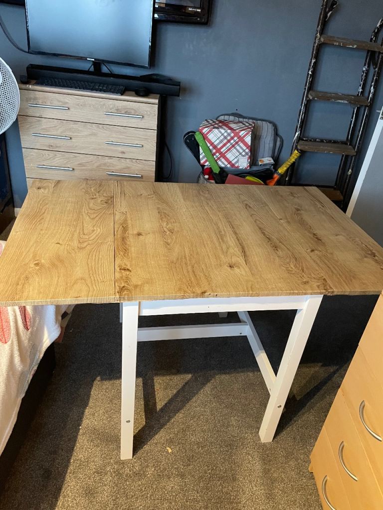 Small kitchen table. 2 or just 1 ends can be extended to make it bigger. No chairs. Buyer to collect . White legs and grey wood effect fablon top