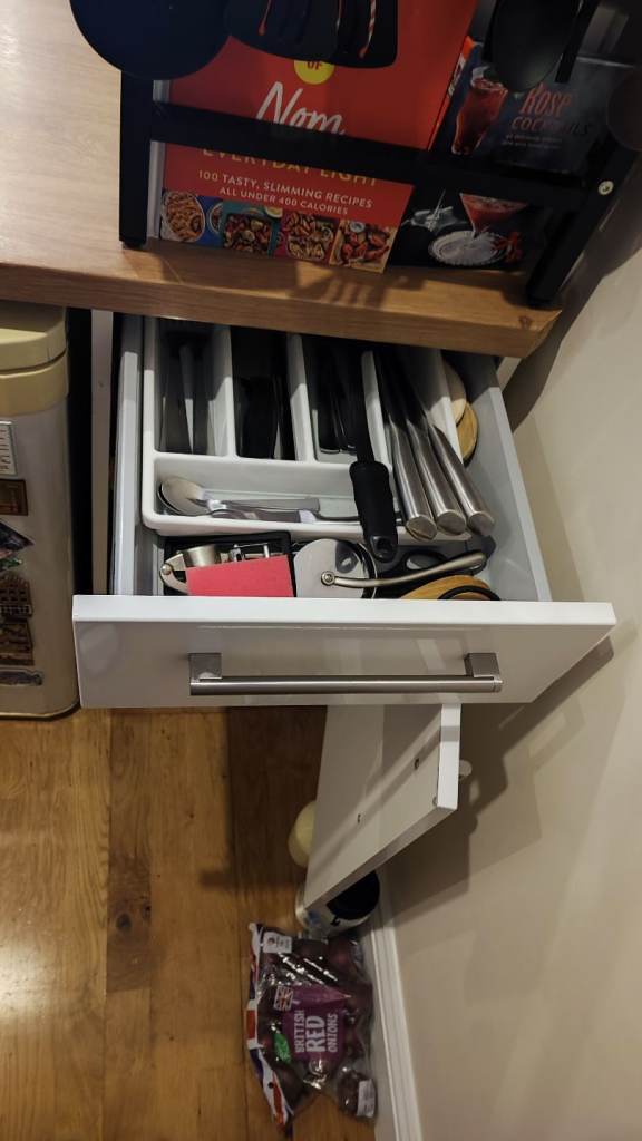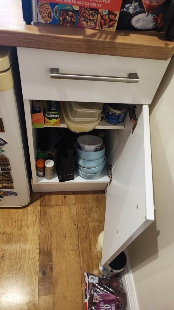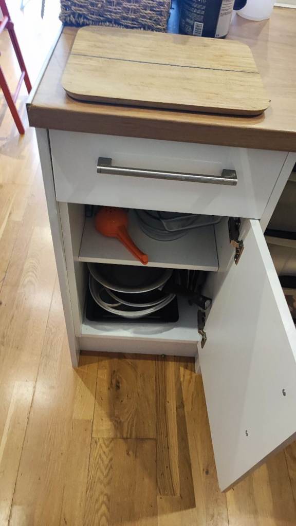 Sturdy wooden kitchen unit with 2 drawers and 2 cupboars with shelf inside.