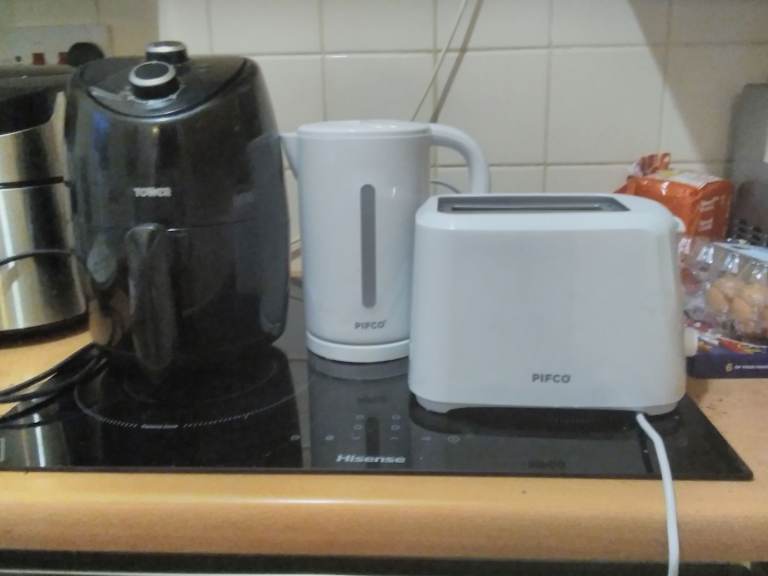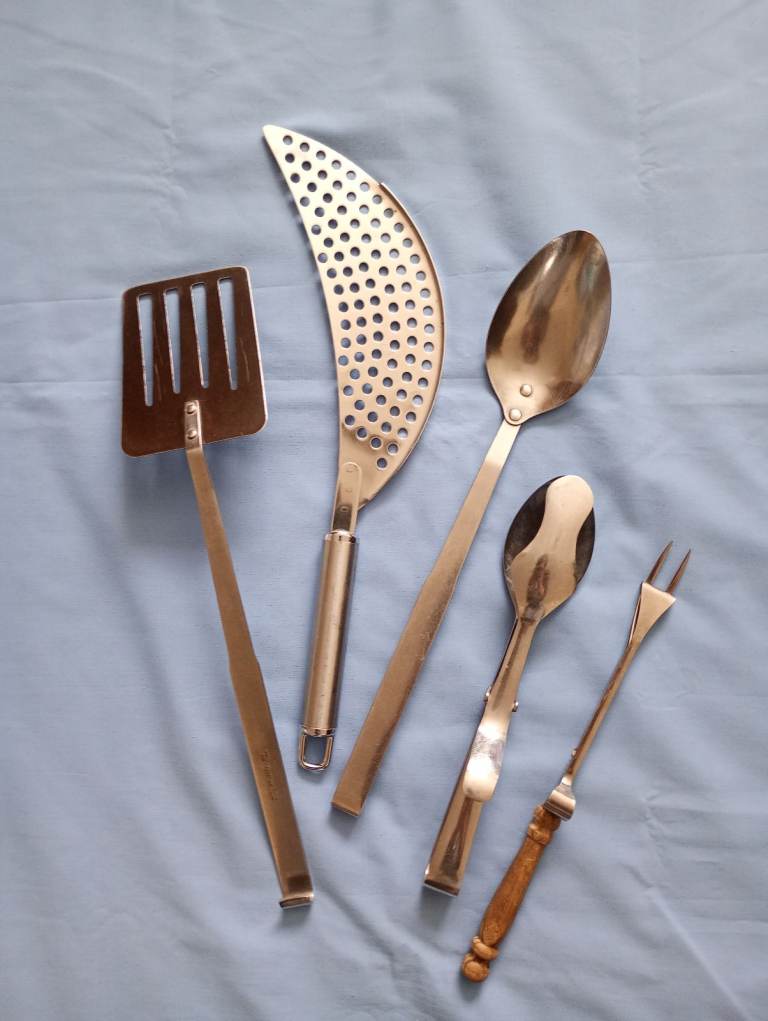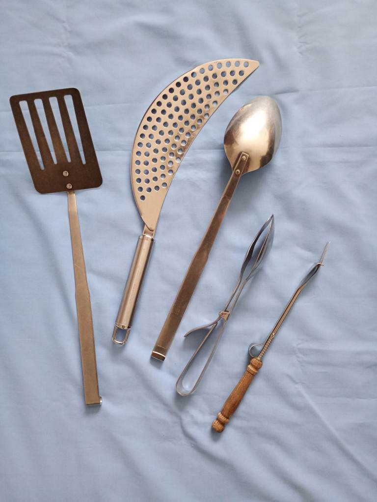 Kitchen utensils include potato/veg. serving spoon, pizza slicer & server, fried food spatula, tongs and pickle fork. All good condition.