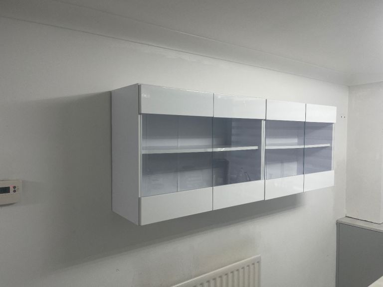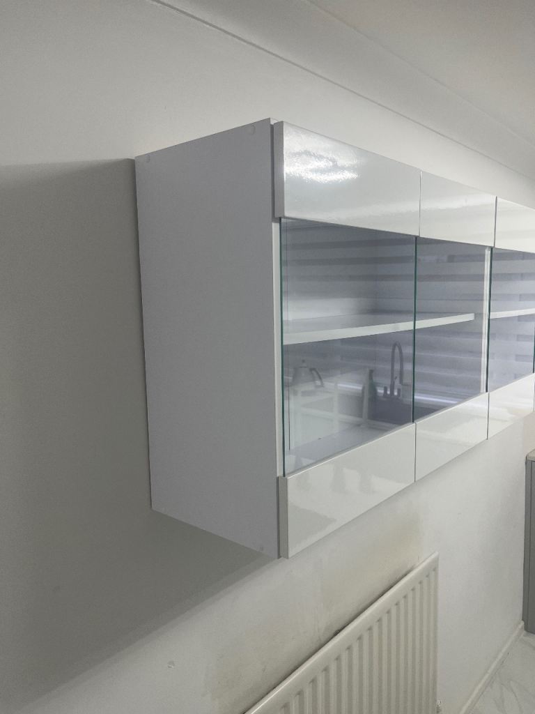 Kitchen wall unit with glass door glossy white , these units are from Wayfair.