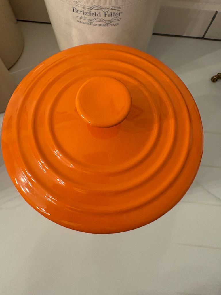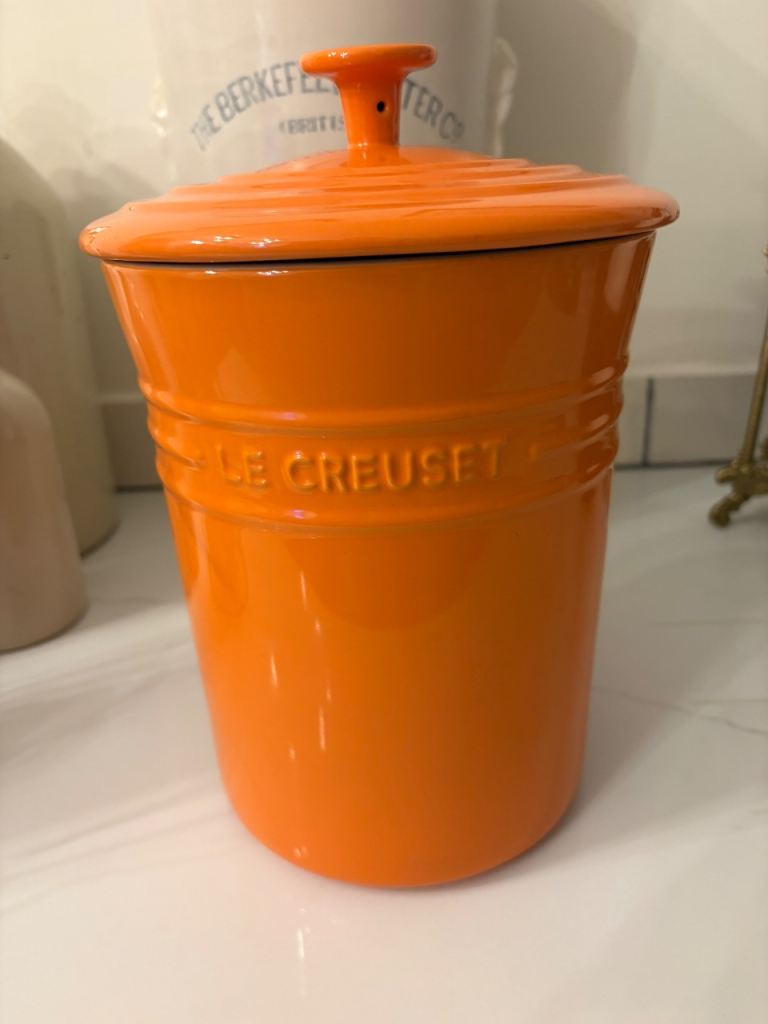 LE CREUSET orange Large Jar approximately 22cm/30cm to top of lid
