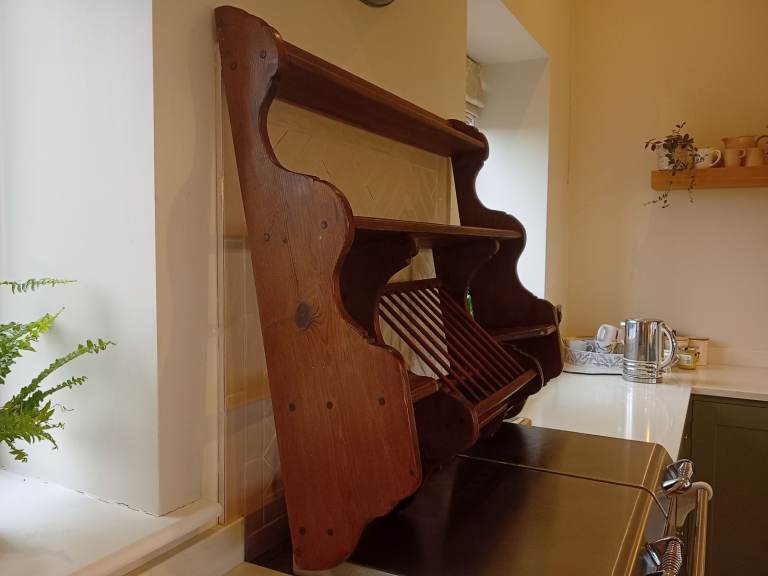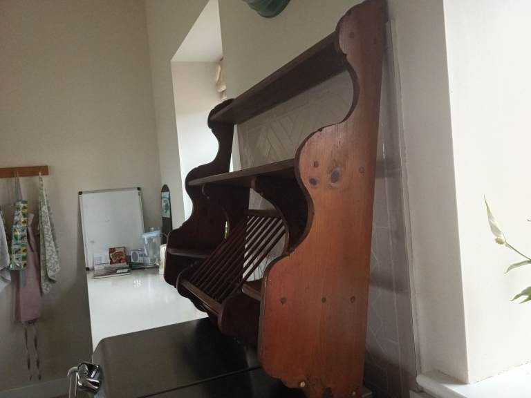 Large vintage penny pine plate rack -holds 10 plates and 8 cups. It also has useful shelves and wall brackets ready to be hung.