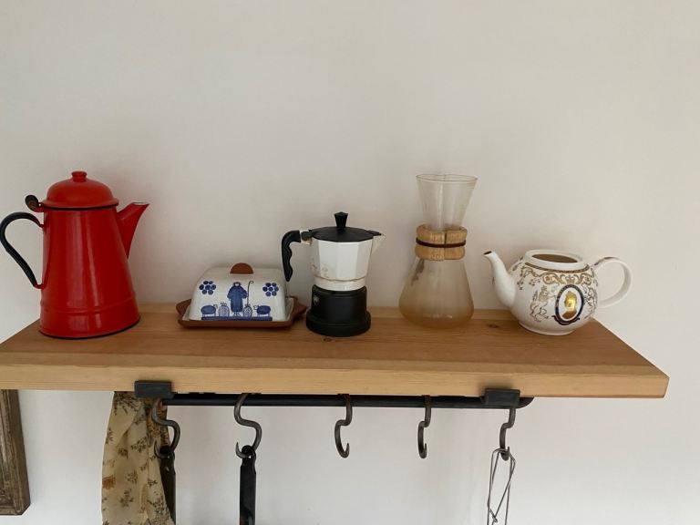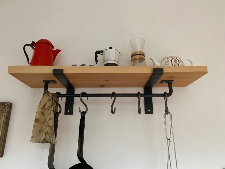 Attractive and sturdy wall-mounted kitchen shelf made from solid wood with black metal brackets and hanging rail. A practical and decorative piece that adds warmth and character to any kitchen.