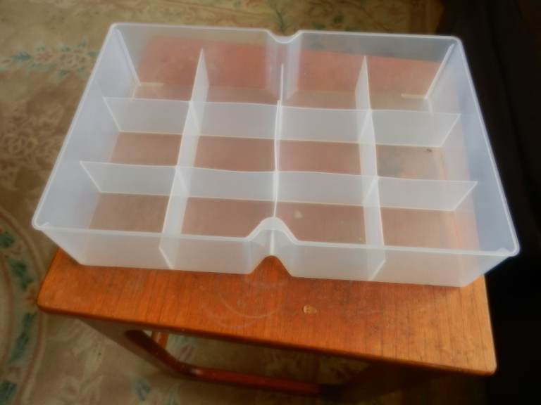 STORAGE TRAYS NEW UNUSED SIZE 32 CM WIDE X 21.5 DEEP X 7.5 CM HIGH, THE DIVIDER SECTIONS ARE MOULDED TO BODY, FROM VERY USEFUL BOX CO. STURDY STORAGE. 12 OFF.