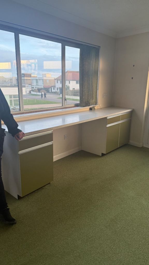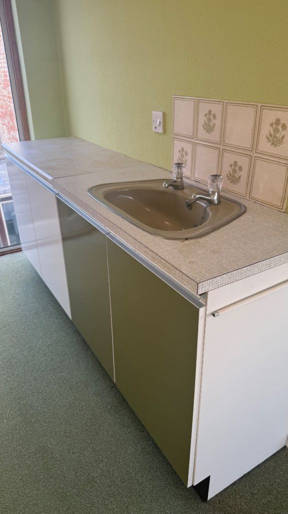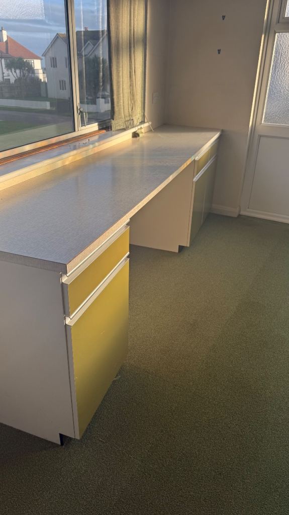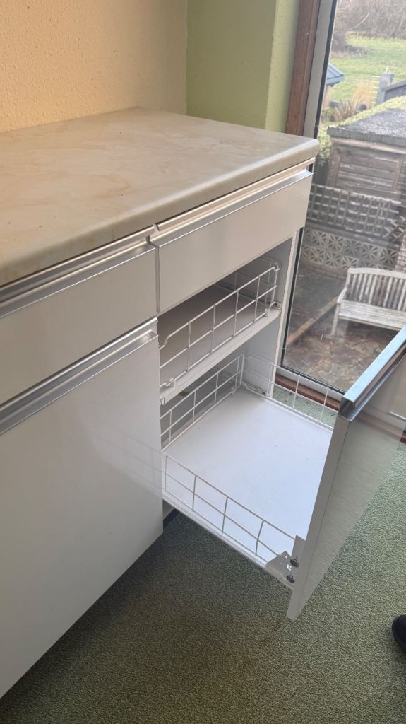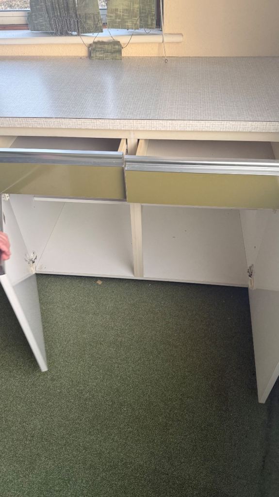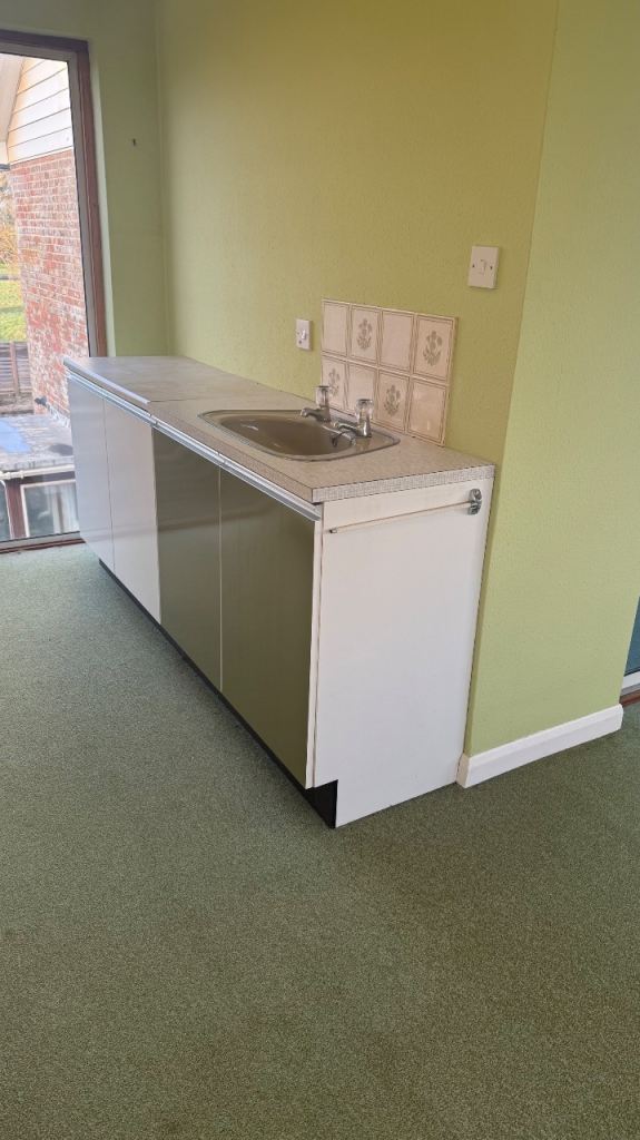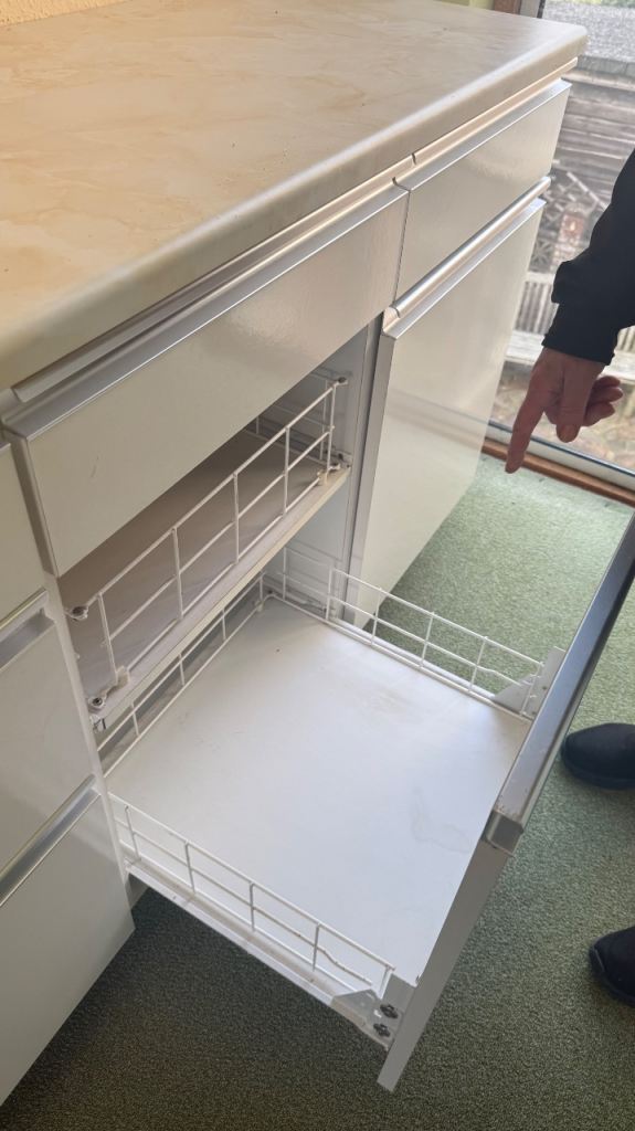 The set includes integrated drawers and cupboards, with generous internal storage throughout. The original sink is present in one section (as shown in photos).