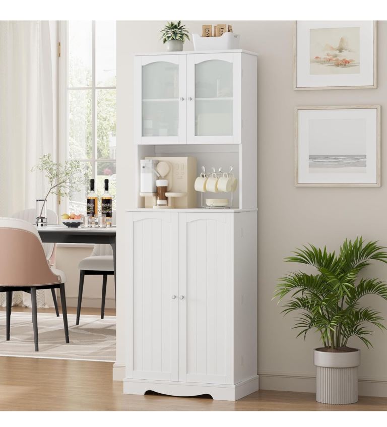 [Multifunctional tall cabinet]: If you are still looking for a freestanding white food pantry cabinet in the kitchen, a kitchen dresser in the dining room, or a coffee bar in the living room, this kitchen pantry cabinet white is your ideal choice because it has ample storage space and spacious display space