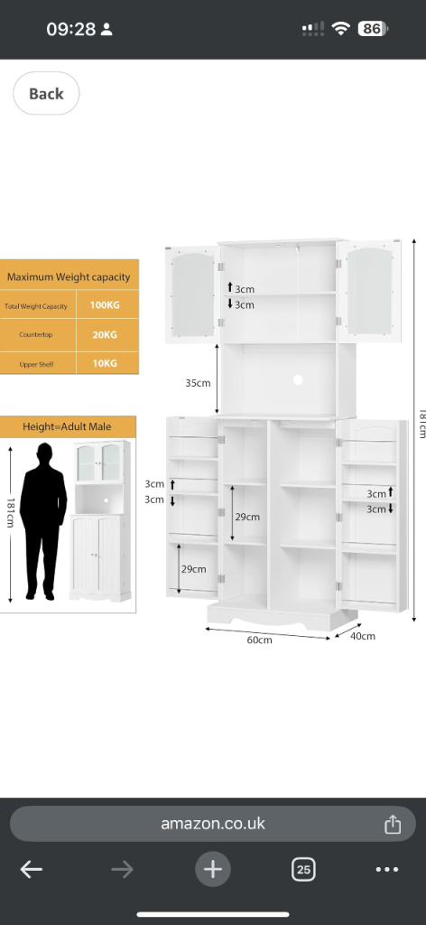 [Material]: This kitchen cabinet is made of solid MDF, which has reliable stability and excellent durability. It can bear a maximum weight of 100 kg. The back of the larder cupboard is equipped with an anti-tipping device, which can stand upright without tipping over. The surface is painted, smooth and delicate, and easy to clean