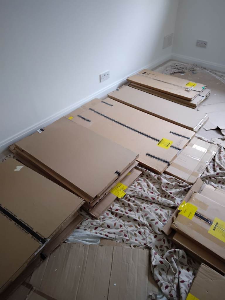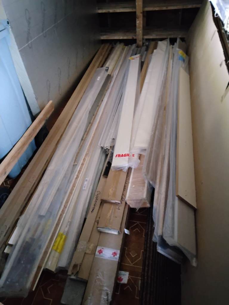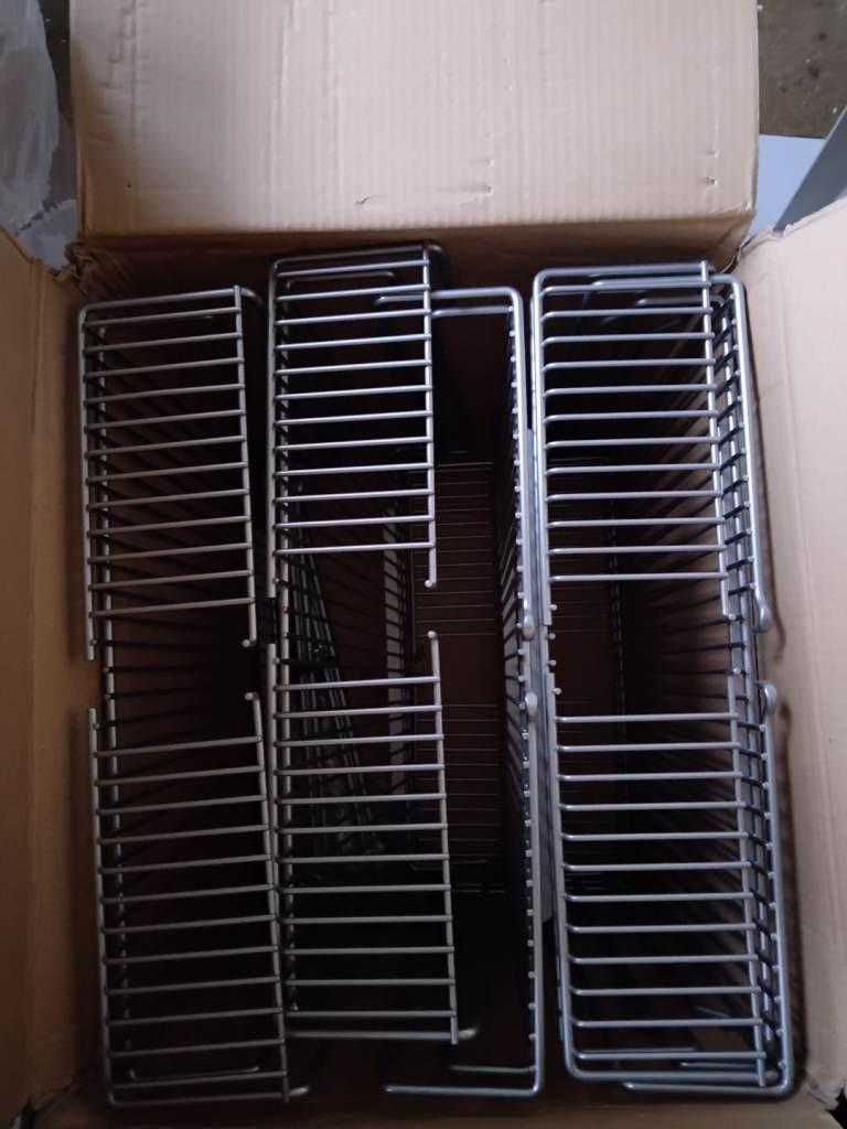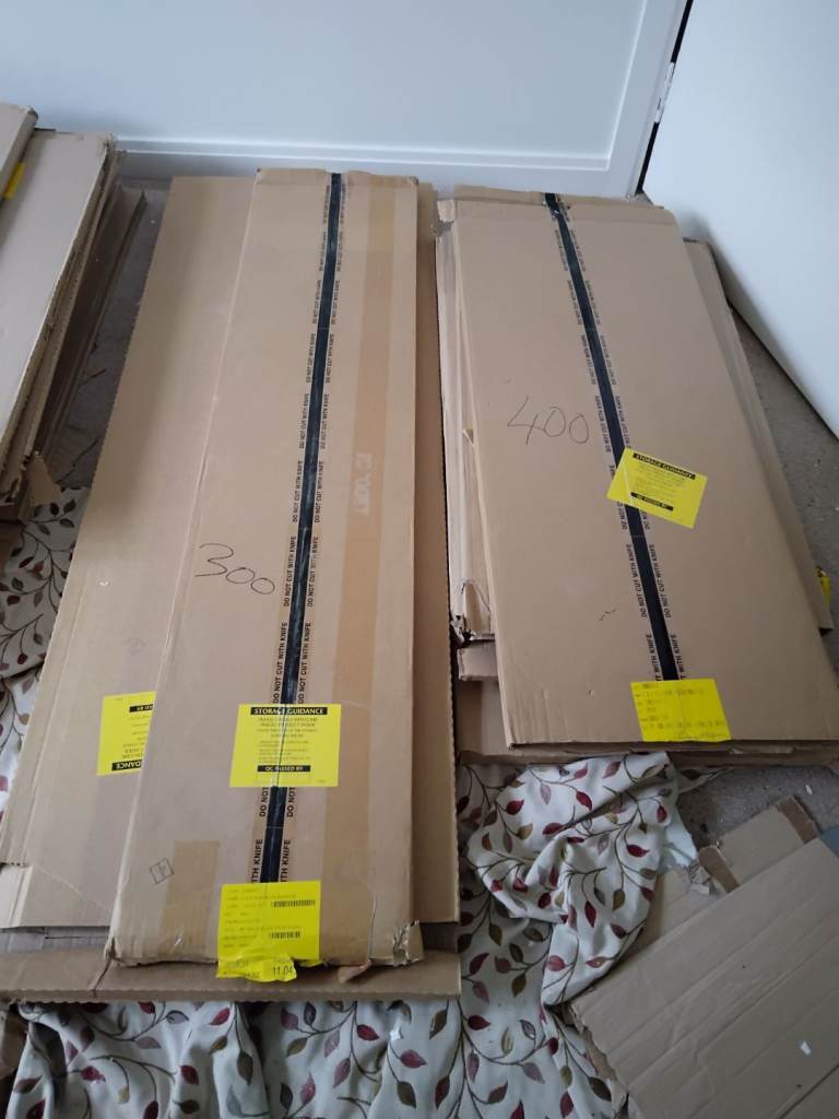 Unused boxed kitchen doors, kick panels, larder rack with baskets, carousel, chrome legs etc