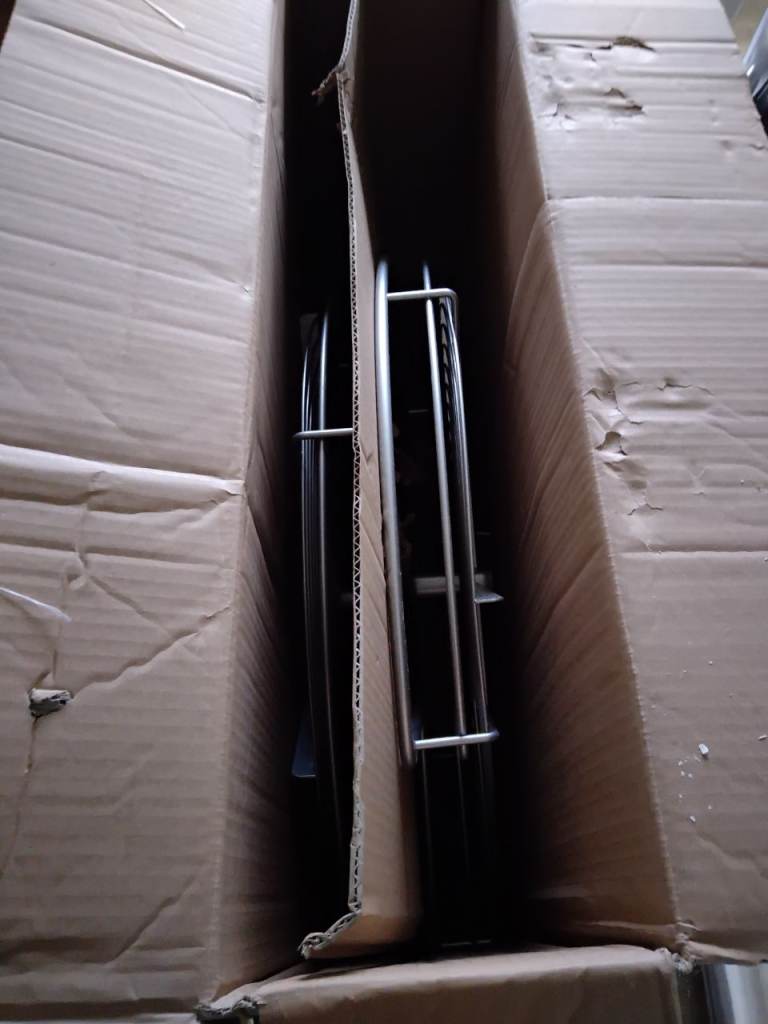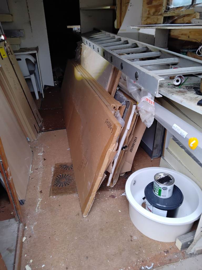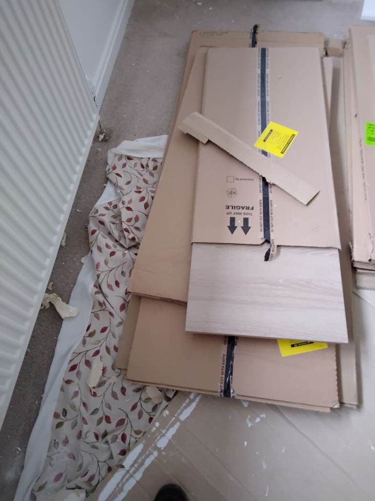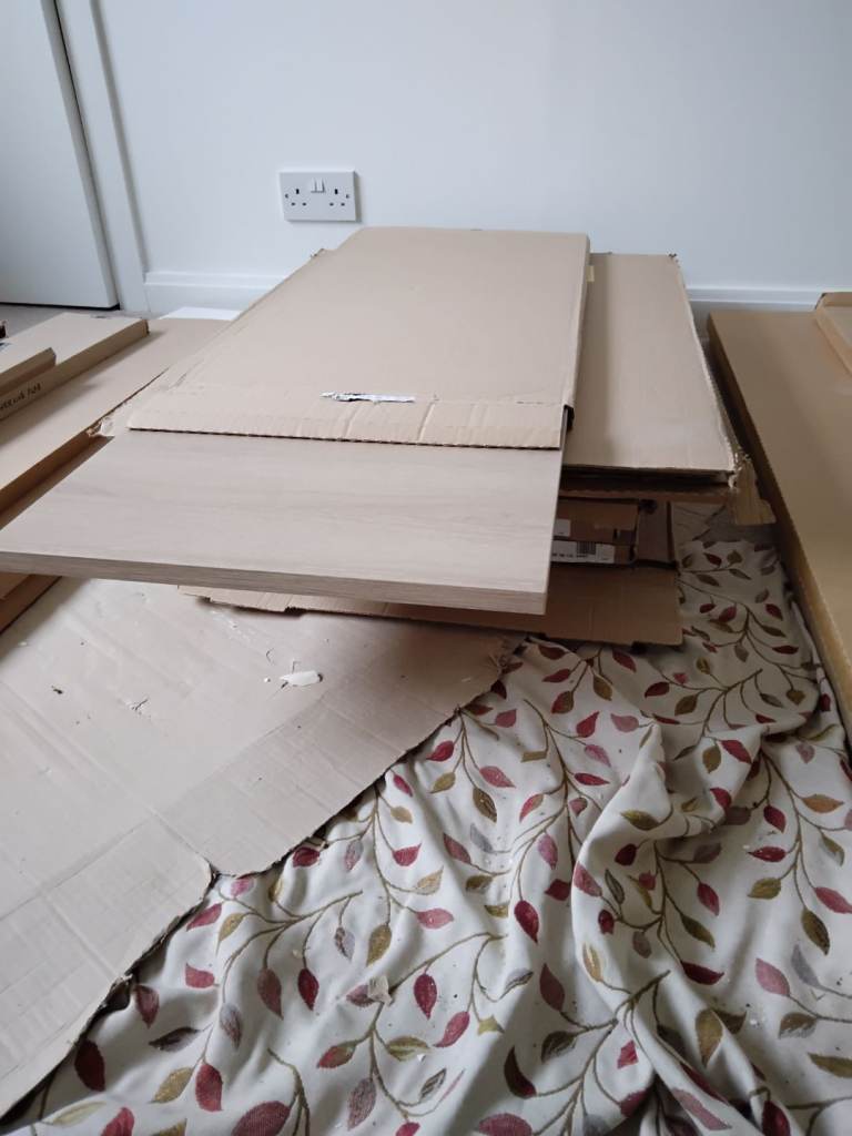 Unused boxed kitchen doors, kick panels, larder rack with baskets, carousel, chrome legs etc
