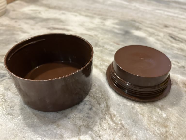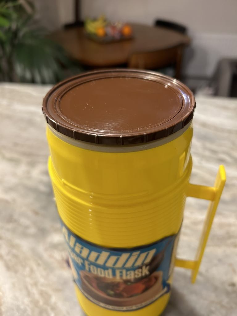 Vintage Aladdin Super Food Flask 1 litre in yellow with brown base and lid.