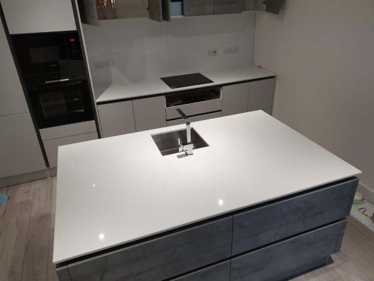 We’re offering the very trendy White Shimmer Quartz worktops at a staggeringly low price of ONLY £1000. This is for a total of 6 linear metres (max width 620mm) and it includes an inset sink cut out, hob cut out and all visible edges will be polished.