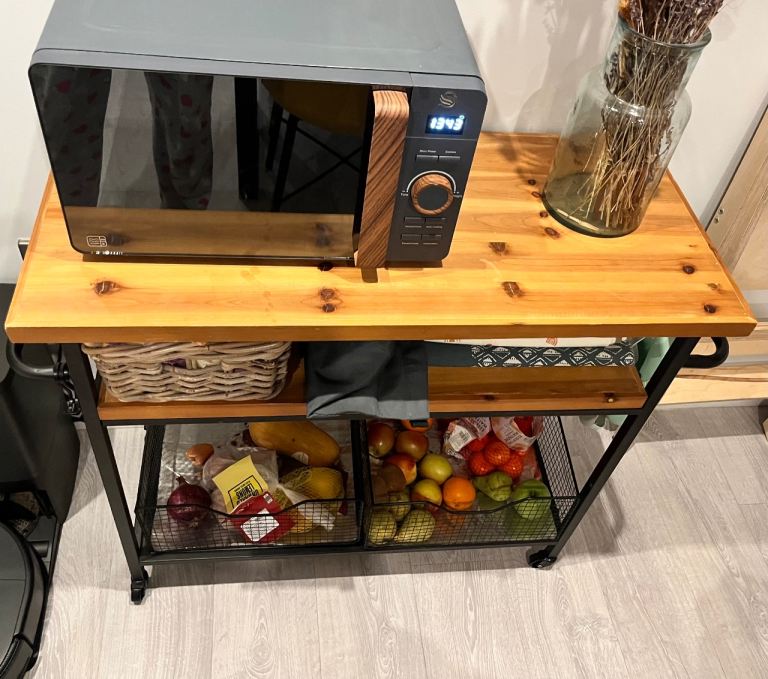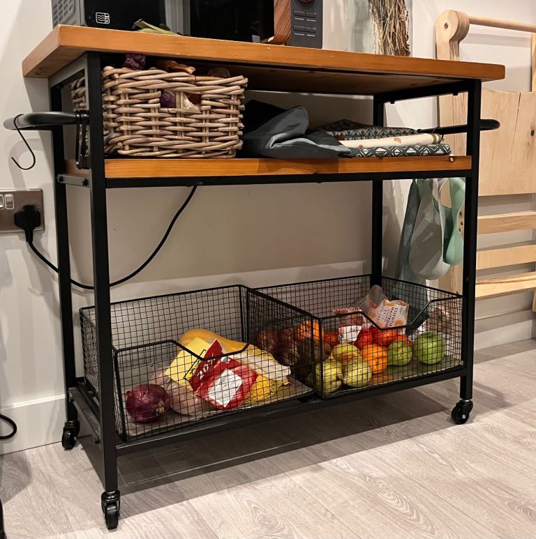 Wood and metal kitchen trolley with metal hooks on the sides. Dimensions: W89cmxH77cmxD40cm