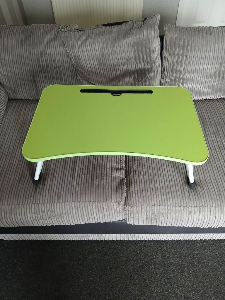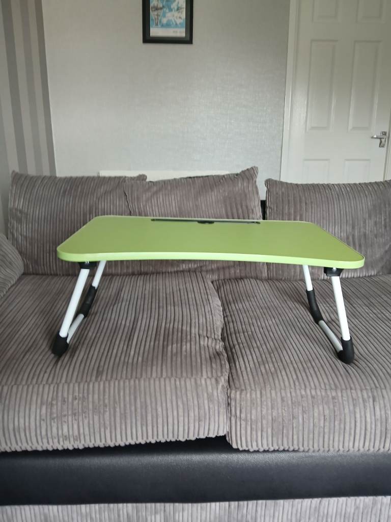 Has black foam on the legs to stop any wear and tear and has black cable accessorie on the table for cable management.