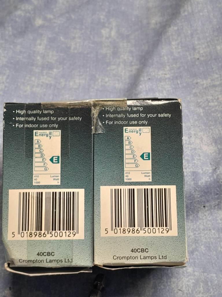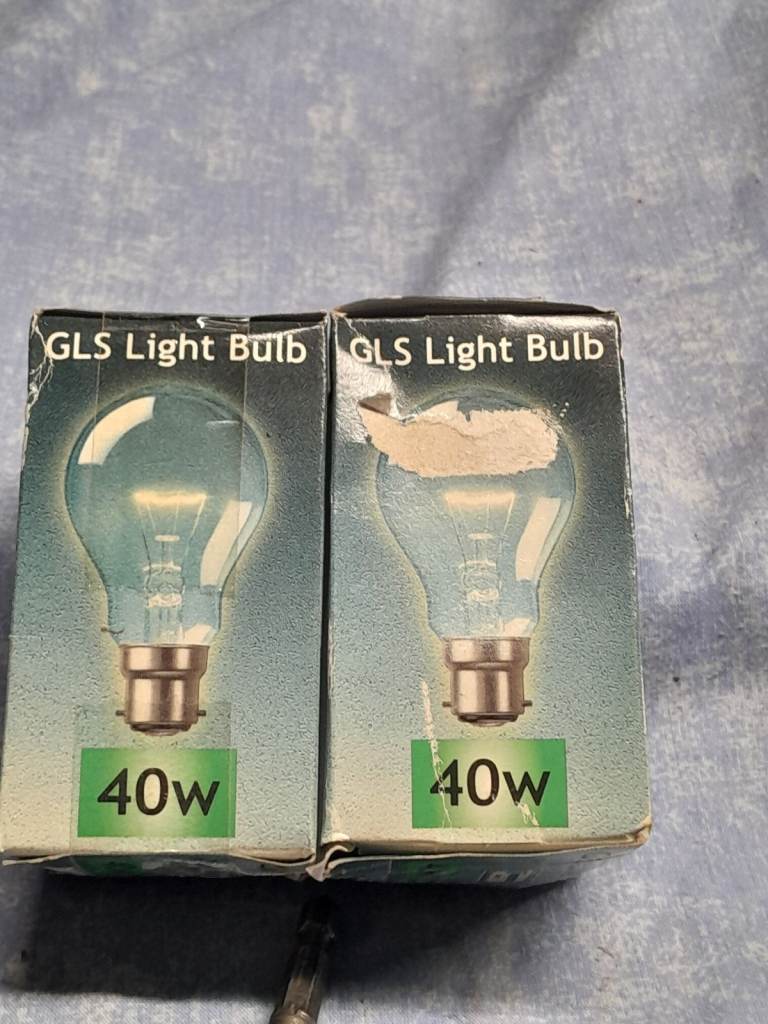 2 light bulbs 40 Watts energy E GLS. Brand new in the box never been used before. £0.50