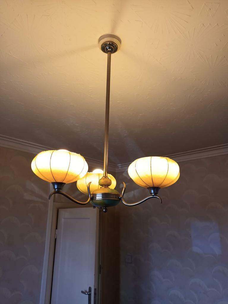 3 arm Art Deco light fitting with original 1920’s opaque champagne glass shades.