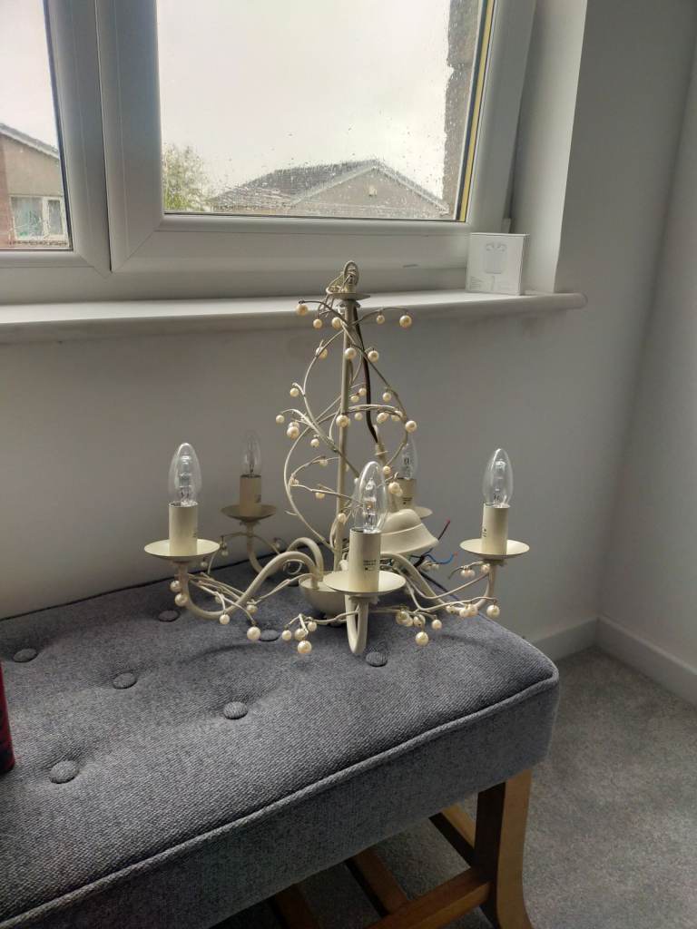 Strikingly beautiful greige or thereabouts, 5 arm Chandelier with bulbs. Reaon for sale, moving house.