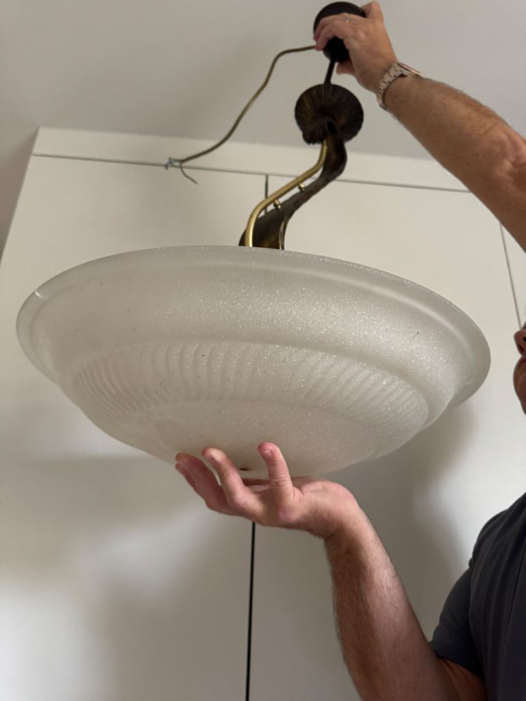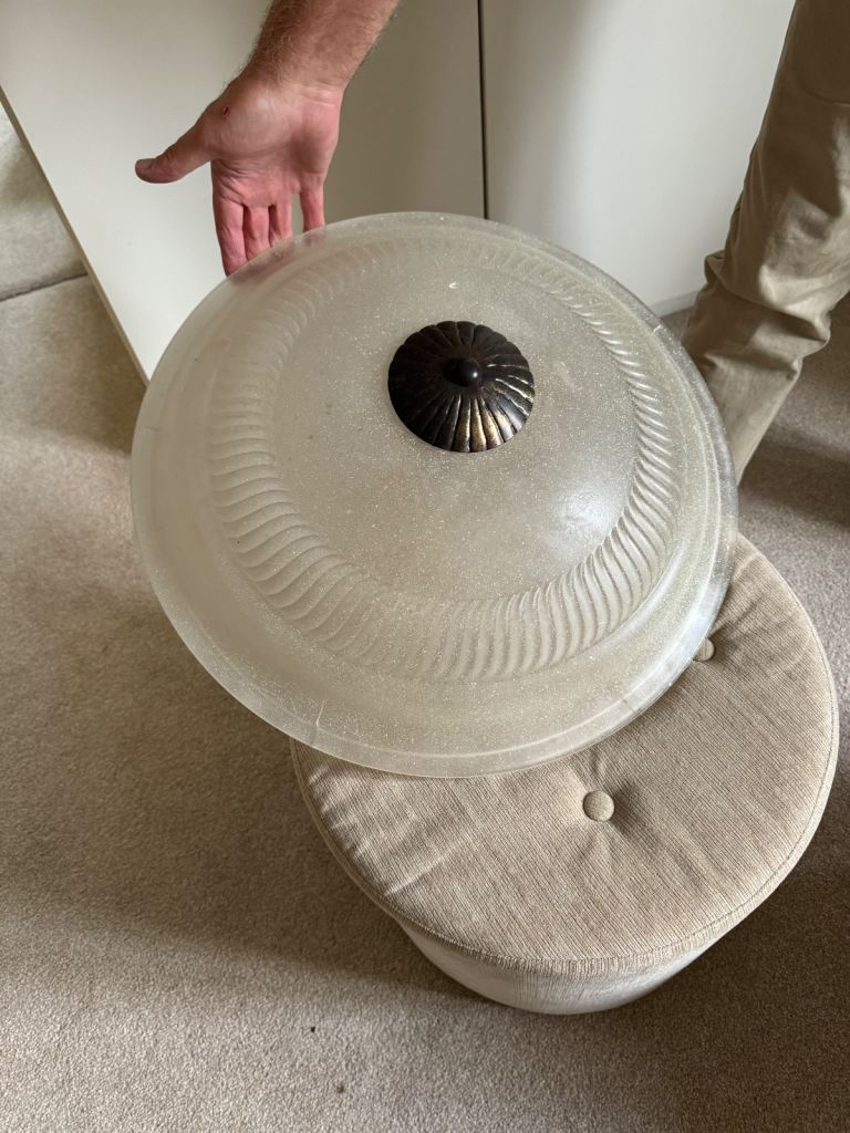 Ceiling light fitting antique bronze/brass with large frosted glass shade takes 3x bulbs glass shade is 50cms diameter x 75-100 cms from ceiling to bottom of the glass.