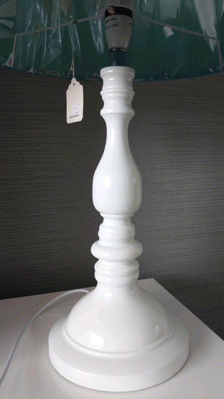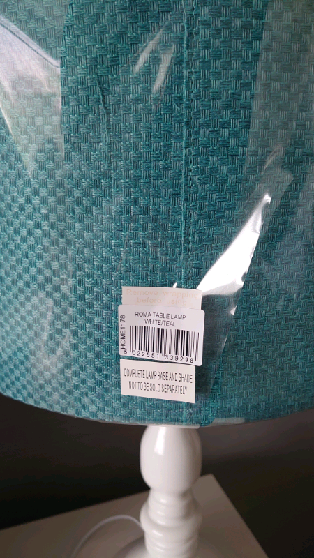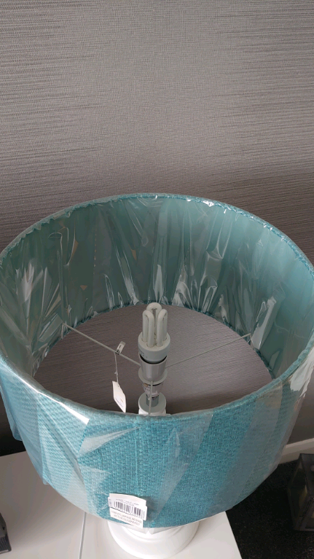 Brand new, bought from sterling furniture. White base with teal coloured lampshade. From smoke free and pet free home. Height 60cm, diameter of shade 38cm.