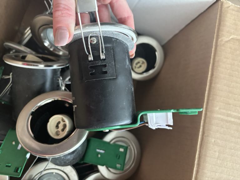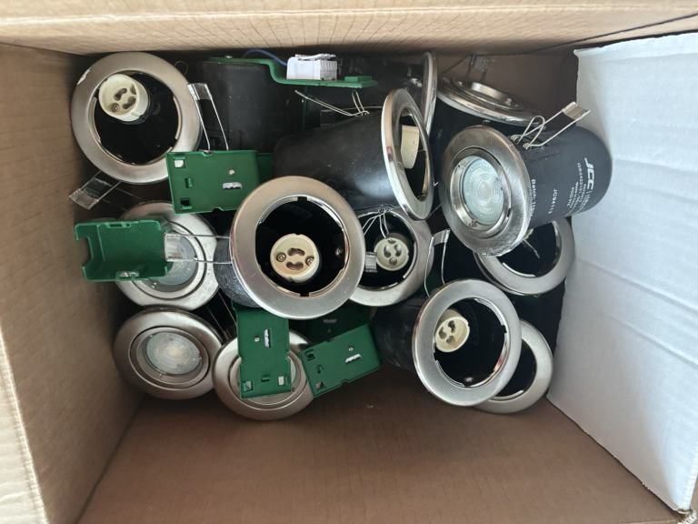 Minimum 12 with fixings. Some have small paint marks that easily wipe. Some bulbs remain. All work well just swapped them out for different design
