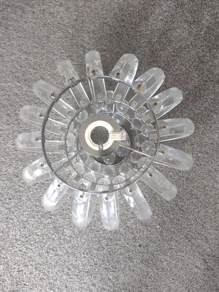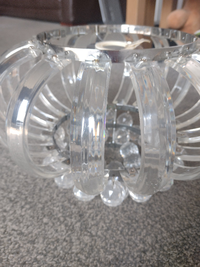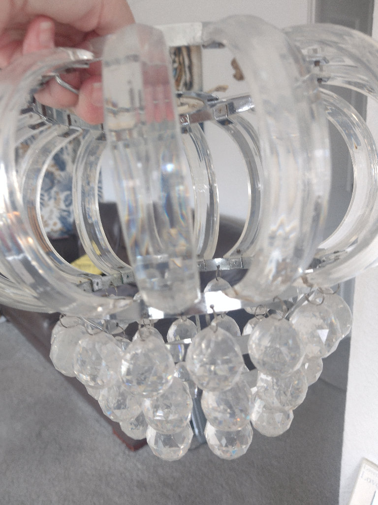Clear ceiling light, sparkles when the sun hits it, it is plastic though, not real crystal, used but still in good condition