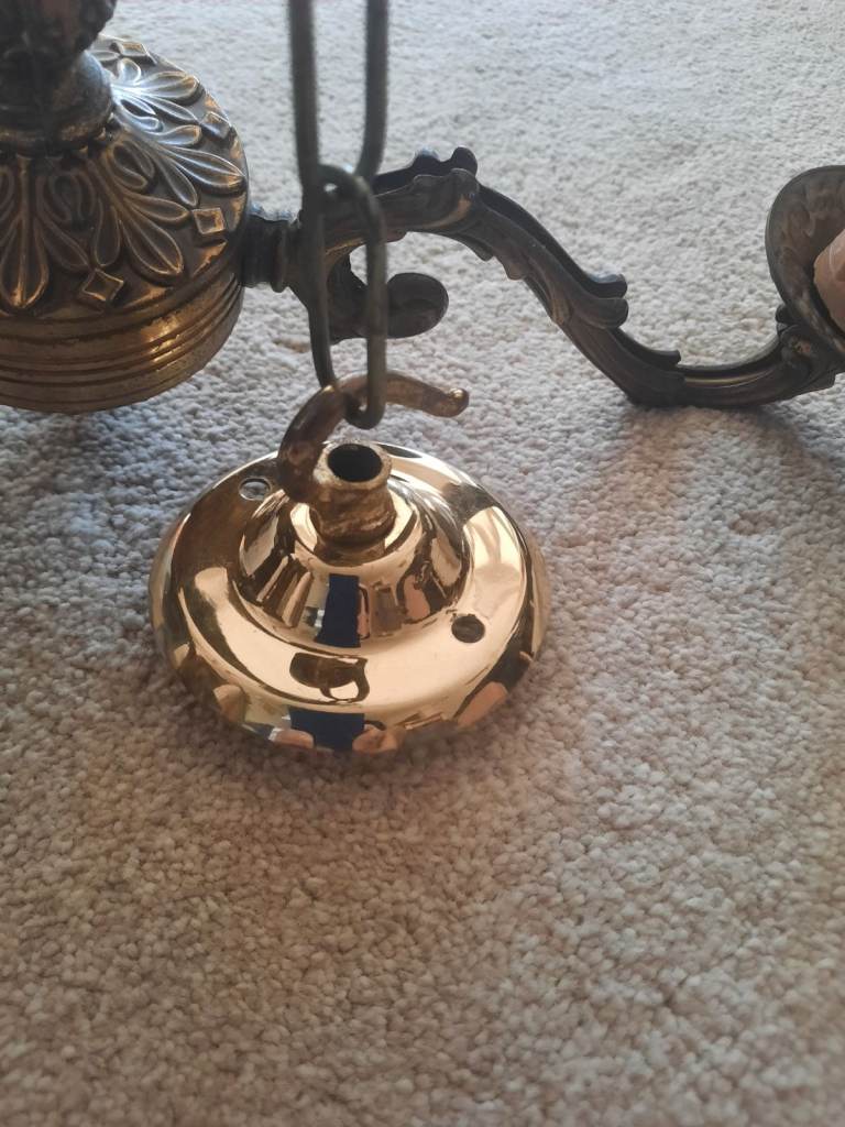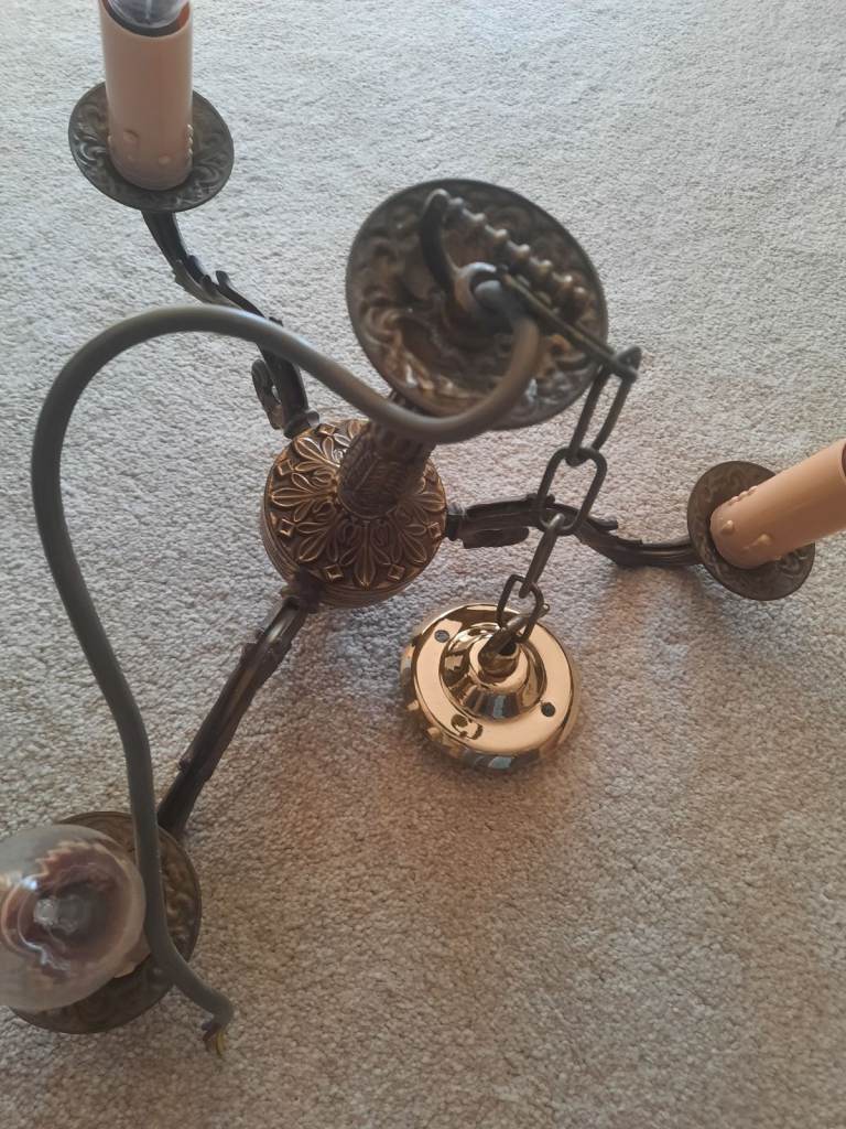 Brass coloured chandelier effect ceiling light, candle effect bulb holders (which can be removed), includes bulbs.