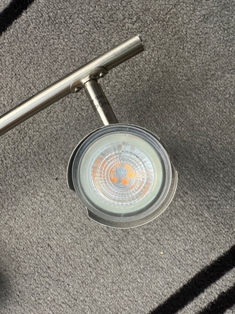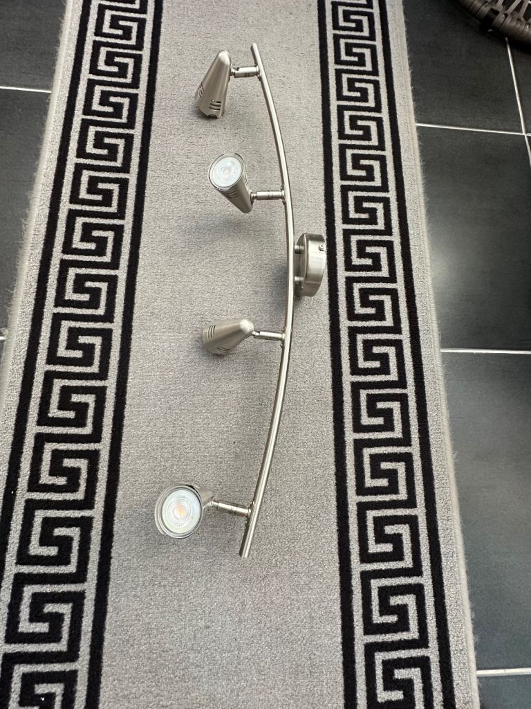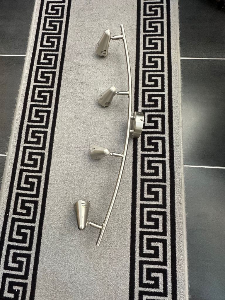 A well maintained and in good condition this silver ornate curved lighting bar consisting of 4 mains voltage GU10 spot lights. Lights are independently adjustable. Ideal for any kitchen or bathroom. Bar is 80 cms in length.