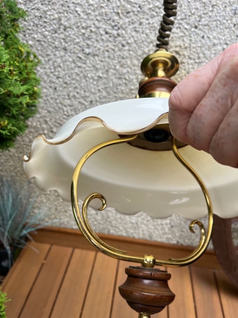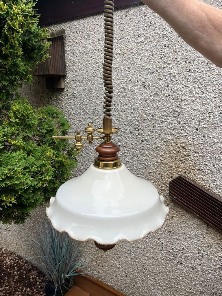 Dining room coil spring light push up pull down ceramic light with brass wood decoration. Curved cream ceramic shade