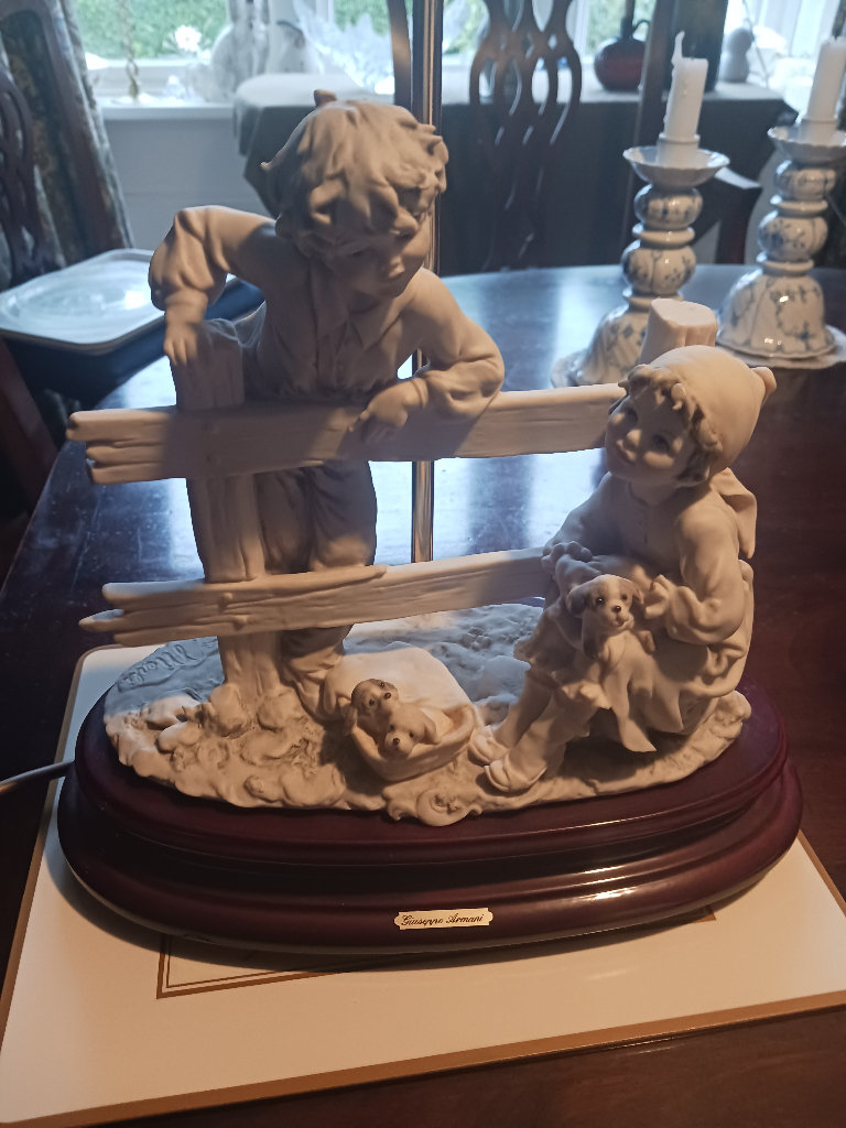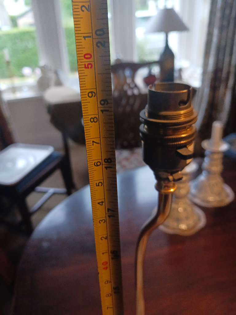 Approx 10.5" tall and base is 11"; wide. Needs a new shade. If advert is live, lamp still for sale.
