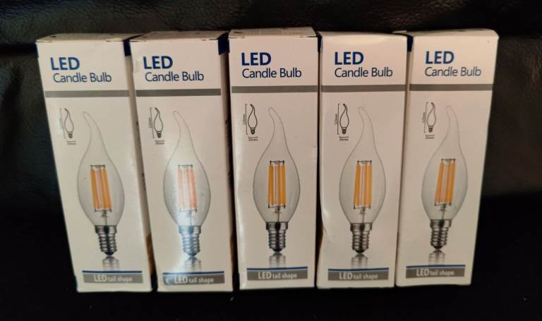 Job-lot of x5 tail-shaped LED Candle bulbs. New & boxed. E14 screw-type, clear glass. Not dimmable.