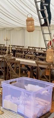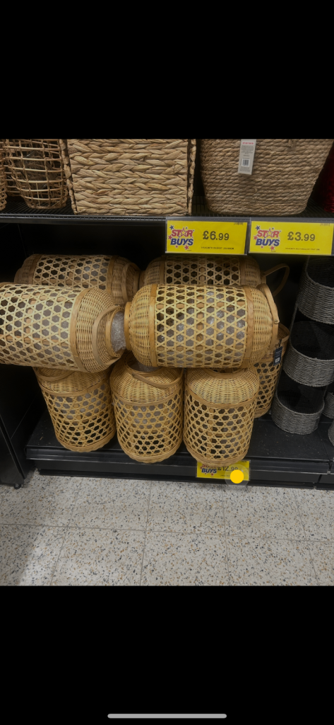 15 rattan lanterns. Bought for £12.99 each. Used for my wedding decor. I put a battery powered candle inside to hang.