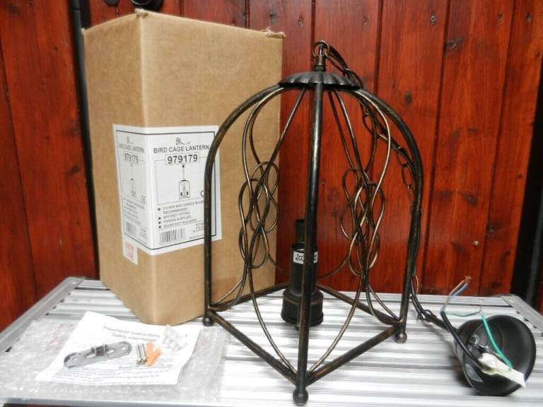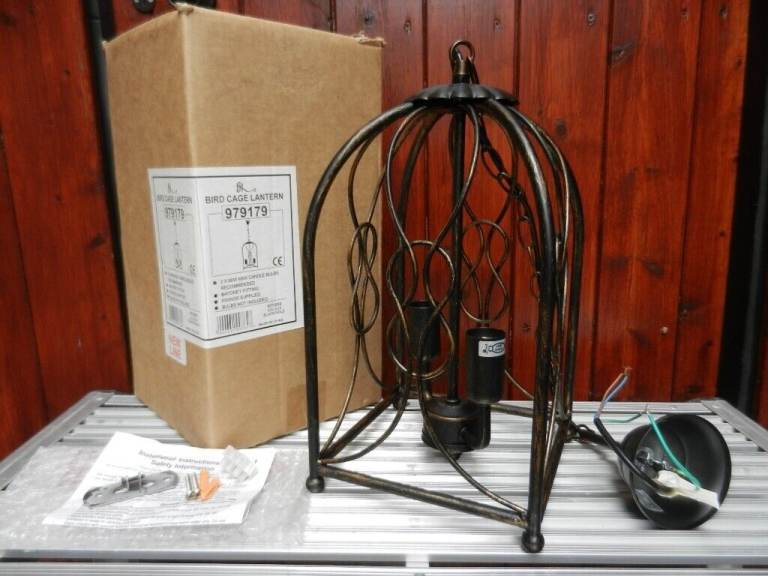 This unusual bird cage light fitting in aged black metal is brand new, purchased, stored and never used due to a change of decor. Requires 2 x 60watt max bulbs. With all fittings and instructions.