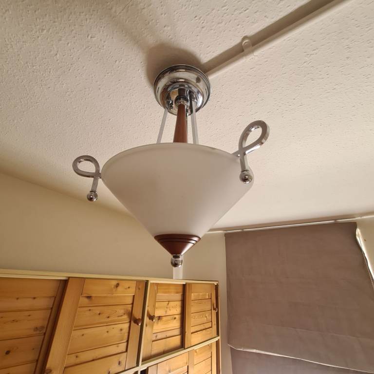 Made in Spain, solid built, great quality of chrome steel, frosted white glass and beautiful solid wood cone. Comes with 3 energy saving bulbs. Warm soft light. Approx Dia. 350mm