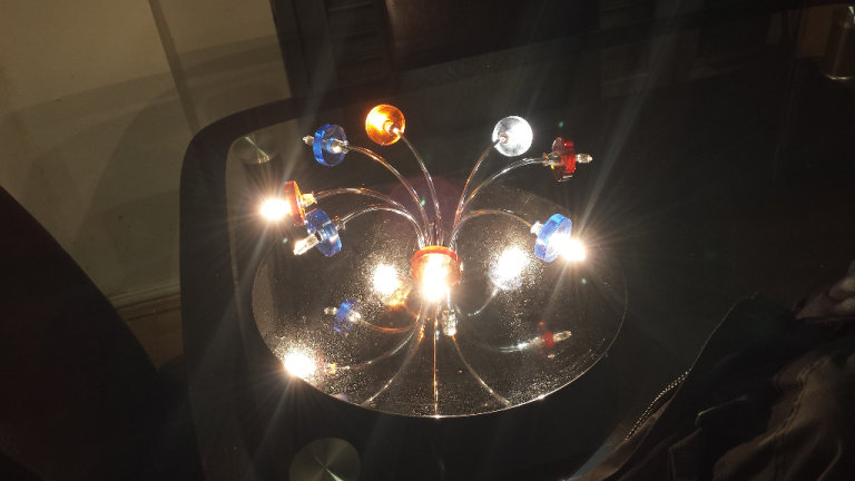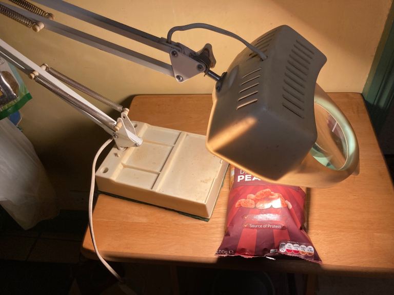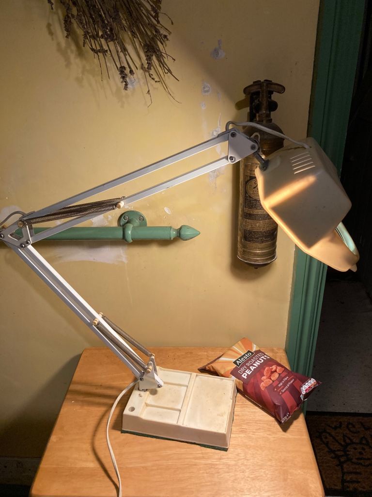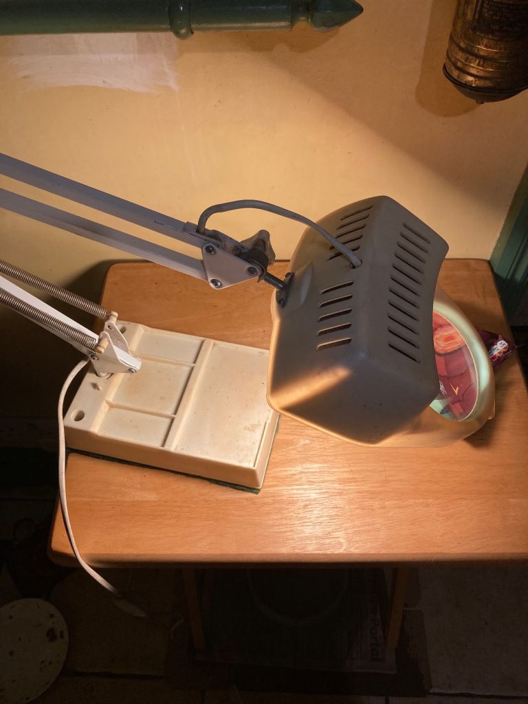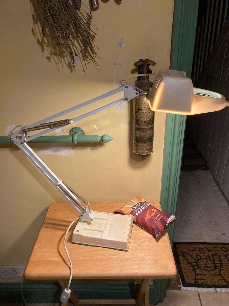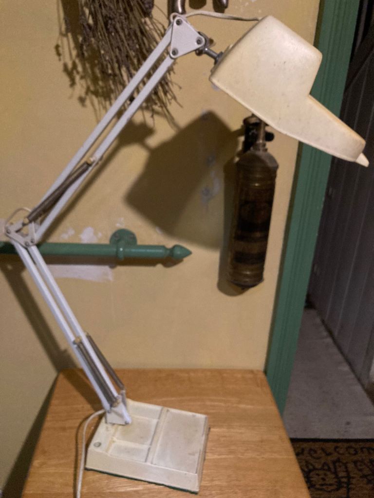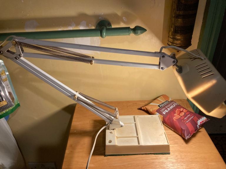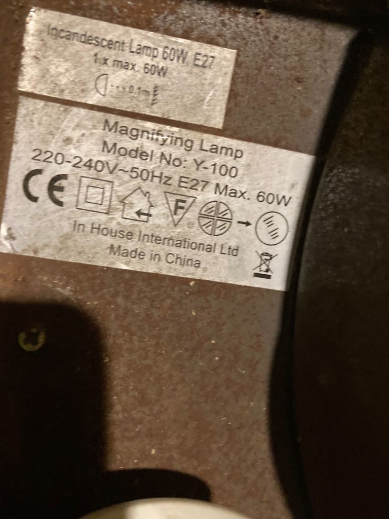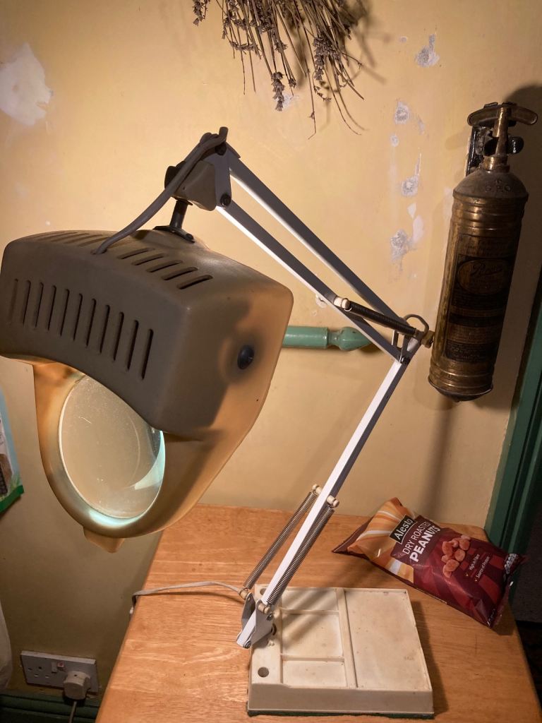 Vintage 360 degree, adjustable angled magnifying glass table lamp, great for reading and hobbies. 100mm magnifying glass, takes e27 lightbulb - standard screw in lightbulb, on / off control switch on cord, power cord is 1.5m long, heavy weighted base with felted surface protector. Shade and base are plastic other parts metal, plastic has yellowed somewhat with age. Pick up only, near Clapham Junction.