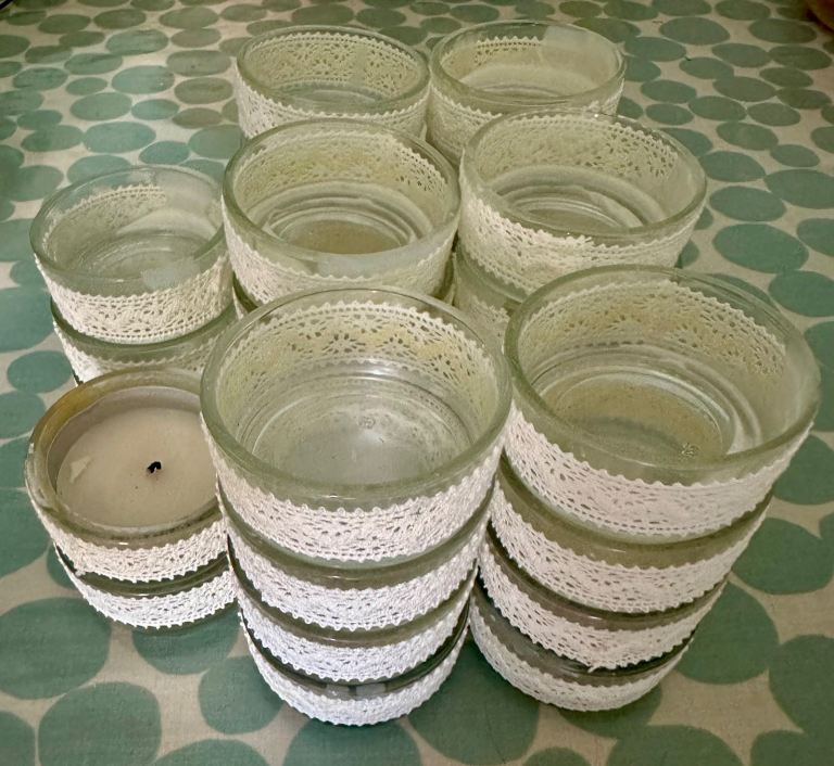 We have 26 of these glass tea light holders. Used once as part of the central table decorations for our wedding.