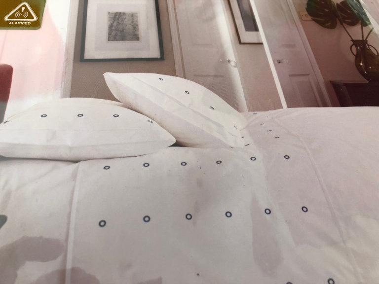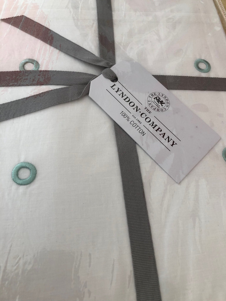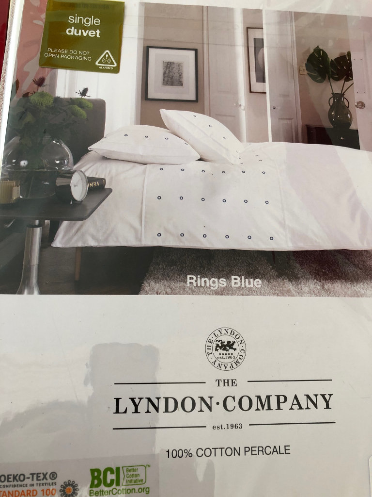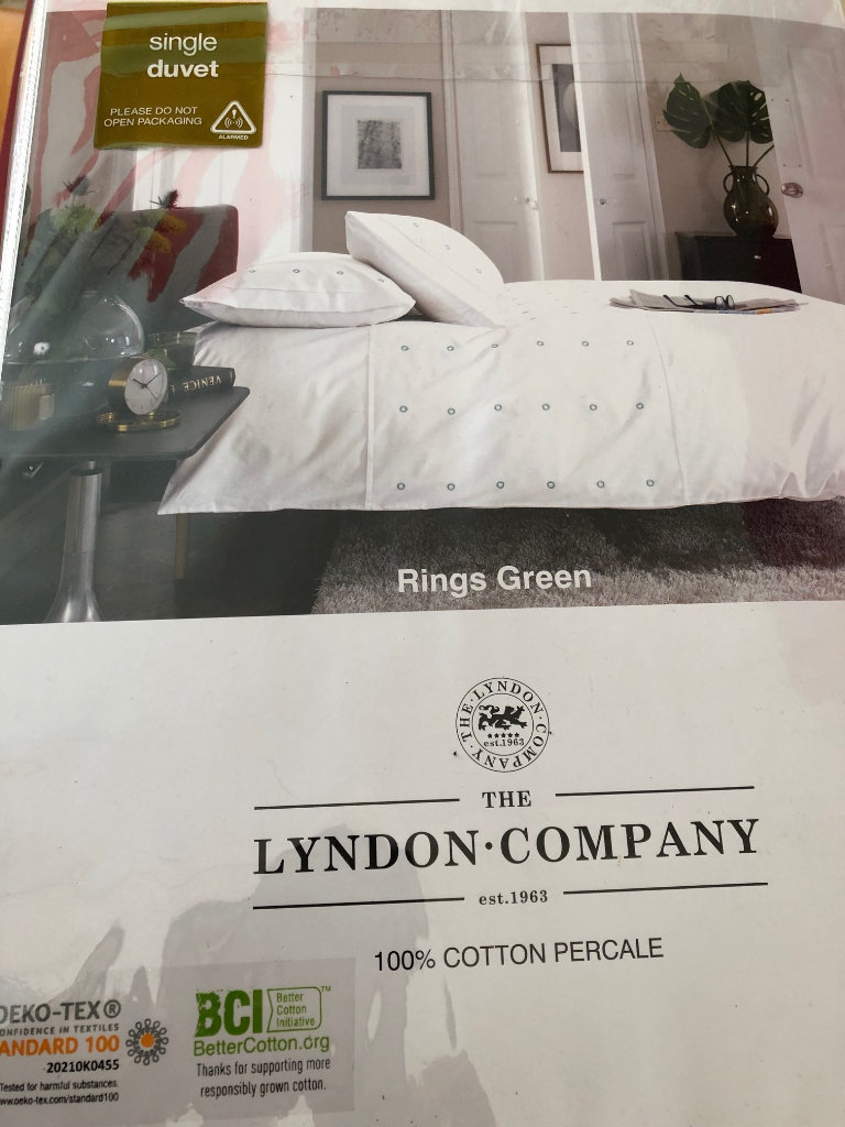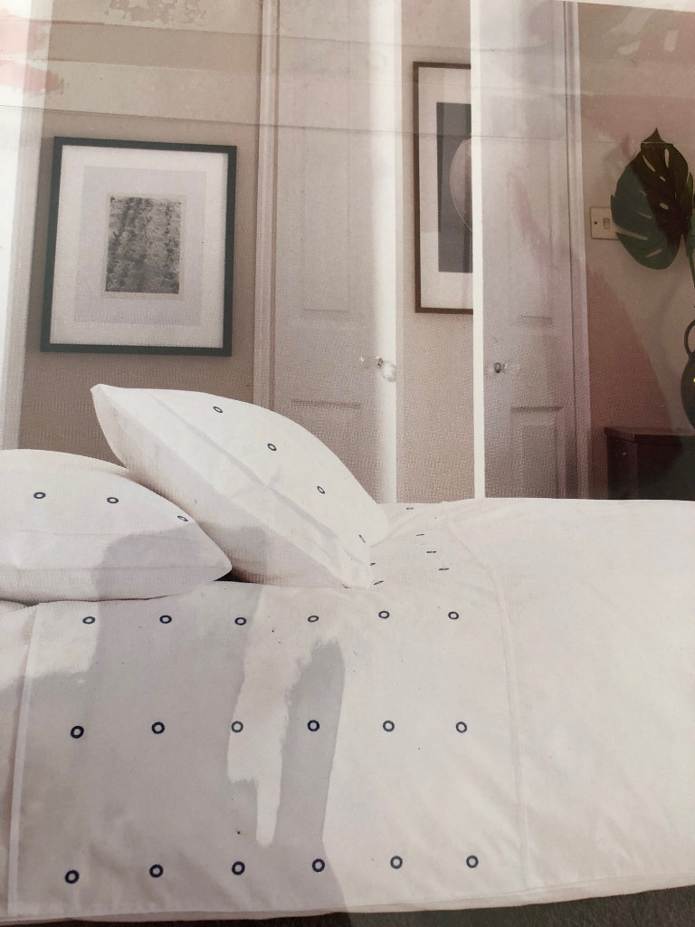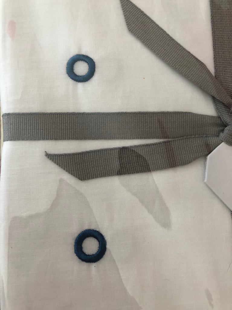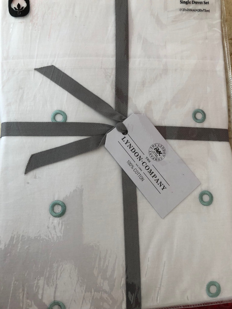 There are 2 matching bedlinen sets available. 1 set white cotton embroidered with Green circles. 1 set white cotton embroidered with Blue circles. Single Bed size. Duvet cover W137cm x L200cm. Pillowcase 50cm x75cm. RRP £90 each.